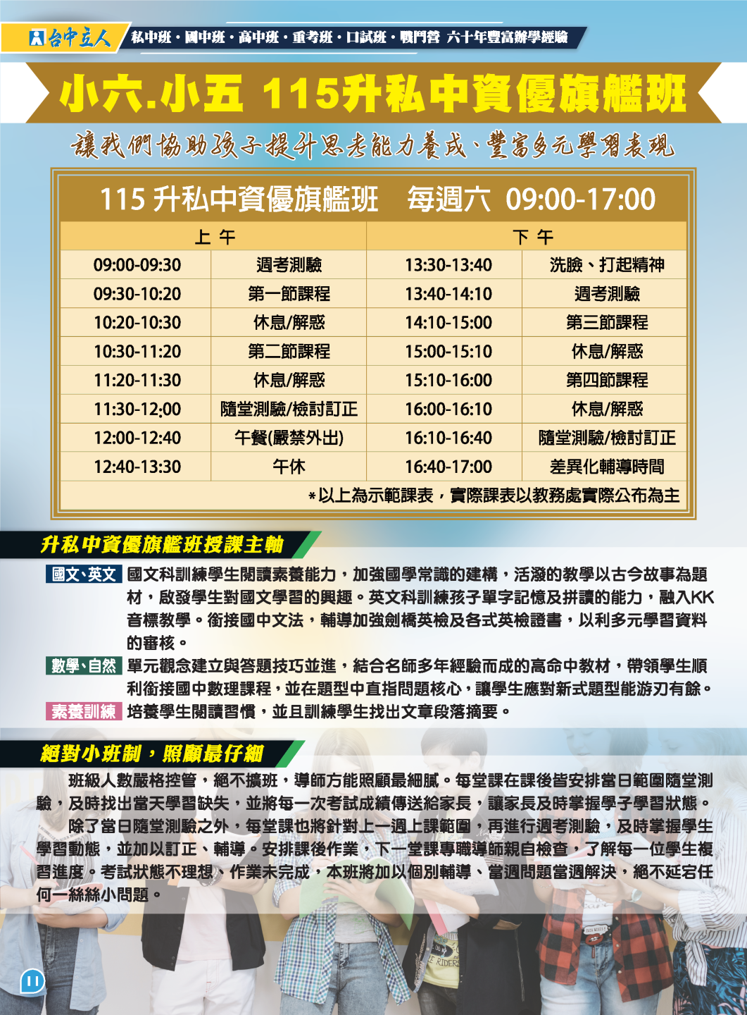 開啟上方區塊 升私中資優班:【114小六(五)】115升私中資優旗艦班-台中立人補習班,重考班,高中班,國中班,私中班 課程報名首頁 升私中資優班 瀏覽數:6082 發佈時間:2025-01-11 搜尋 選擇課程分類 升大學重考班高中班課程國中班課程升私中資優班彰化分部課程 送出 課程標題:【114小六(五)】115升私中資優旗艦班 上課教室:國中班 課程班級:私中班 報名狀態:報名進行中 課程狀態:啟用中 報名紀錄查詢 可查詢所有報名紀錄限報名者 LINE線上客服 頁面QRcode 點擊Facebook分享及讚按鈕,會開啟新視窗輸入內容 開課時間:2025-04-19 09:00 / 結束時間:2025-08-30 17:00 課程星期:星期六 上課地點:臺中市北區三民路三段94巷2號 課程費用:線上洽詢 課程說明 點我加入台中立人官方LINE 【點擊我進入升私中資優班課程線上預約單】 點我加入台中立人官方LINE 【點擊我進入升私中資優班課程線上預約單】 報名須知 親愛的家長、同學您好: 歡迎您的加入,有關於本班課程詳細規劃,歡迎點擊預約唷 本班會盡快請老師回覆您 【重考班課程】線上預約表單連結 【高中班課程】線上預約表單連結 【國中班課程】線上預約表單連結 【私中班課程】線上預約表單連結 【口試班課程】線上預約表單連結 ★台中立人高中班、重考班諮詢專線:04-22238788 ★班址:台中市北區尊賢街9號9樓(台中一中前水利大樓9樓) ———————————————————— ★台中立人私中班、國中班諮詢專線:04-22269882 ★班址:台中市北區三民路三段94巷2號(台中科大天橋巷內) 台中立人官方Line 台中立人官方Facebook粉絲團 台中立人官方YouTube頻道 台中立人官方Instagram 台中立人官方Threads 前往課程報名