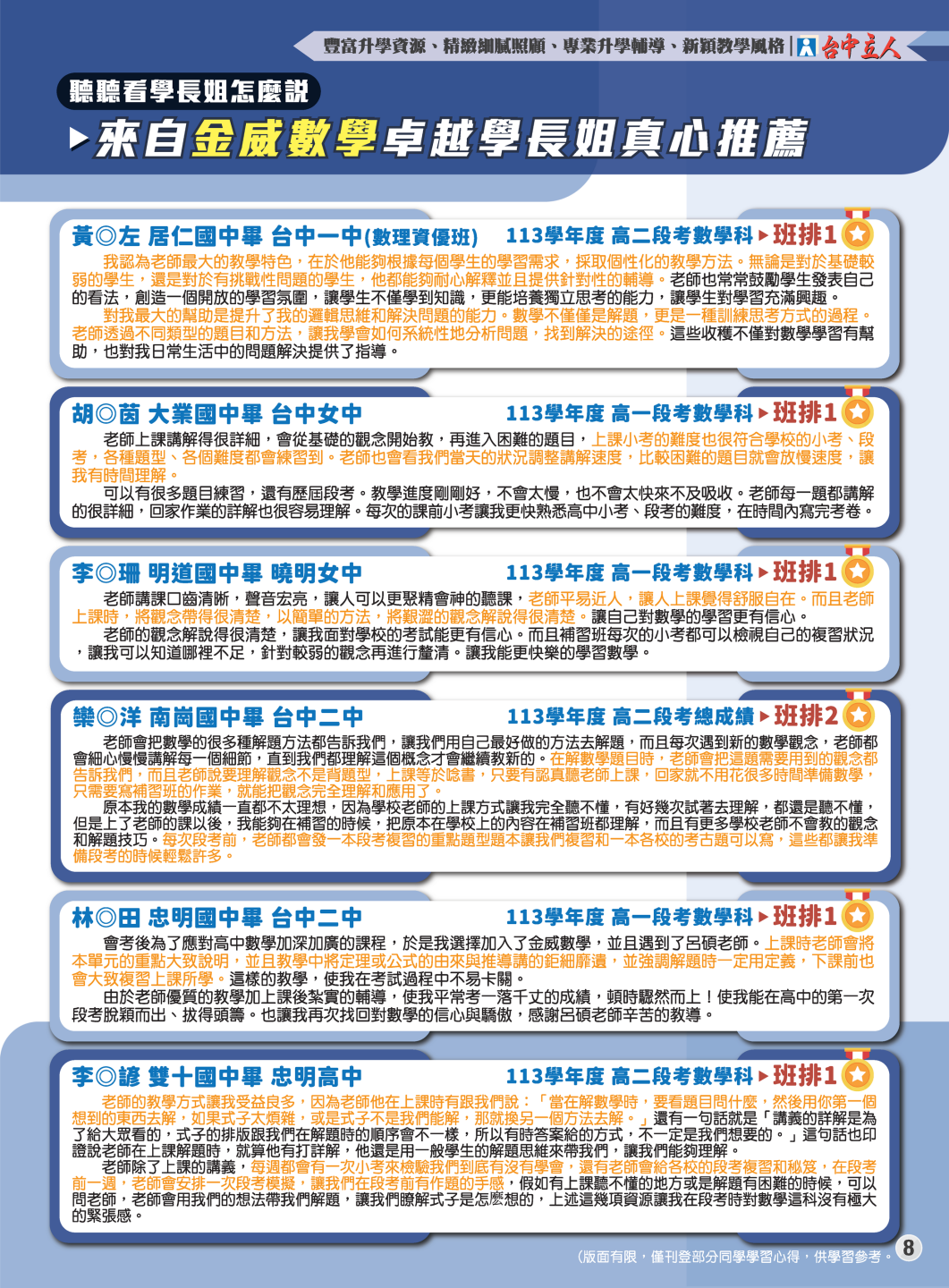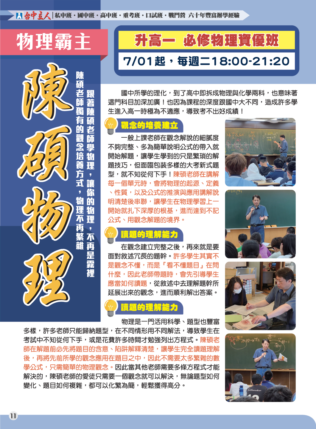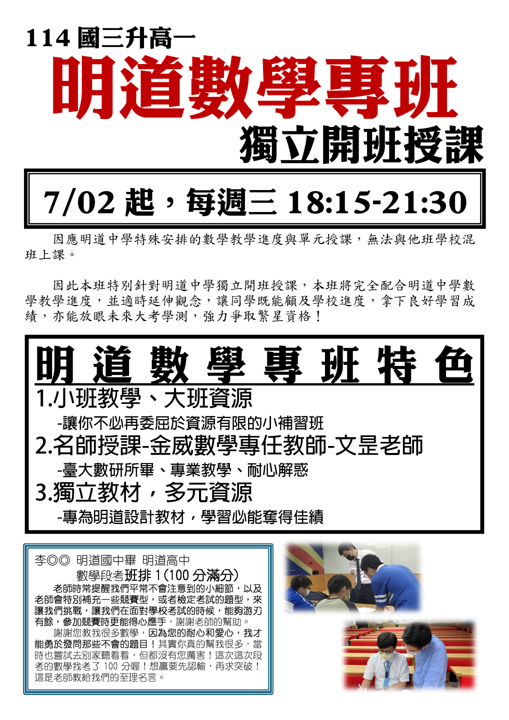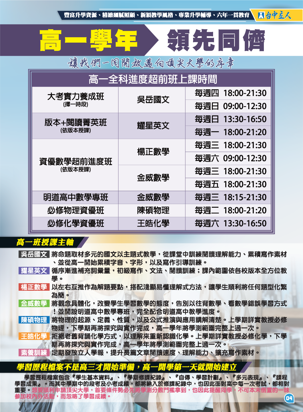 開啟上方區塊 114高一班課程:【114高一】資優超前進度班-台中立人補習班,重考班,高中班,國中班,私中班 課程報名首頁 114高一班課程 瀏覽數:43319 發佈時間:2025-03-16 搜尋 選擇課程分類 升大學重考班高中班課程國中班課程升私中資優班彰化分部課程 送出 課程標題:【114高一】資優超前進度班 上課教室:高中班 課程班級:高中班 報名狀態:報名進行中 課程狀態:啟用中 報名紀錄查詢 可查詢所有報名紀錄限報名者 LINE線上客服 頁面QRcode 點擊Facebook分享及讚按鈕,會開啟新視窗輸入內容 開課時間:2025-06-29 18:00 / 結束時間:2026-01-11 17:00 課程星期:星期一 星期二 星期三 星期四 星期五 星期六 星期日 上課地點:臺中市北區尊賢街9號9樓 課程費用:線上洽詢 課程說明 點我加入台中立人官方LINE 【點擊我進入高一班課程線上預約單】 點我加入台中立人官方LINE 【點擊我進入高一班課程線上預約單】 附件下載 download attachment 報名須知 親愛的家長、同學您好: 歡迎您的加入,有關於本班課程詳細規劃,歡迎連結預約唷 本班會盡快請老師回覆您 【重考班課程】線上預約表單連結 【高中班課程】線上預約表單連結 【國中班課程】線上預約表單連結 【私中班課程】線上預約表單連結 【口試班課程】線上預約表單連結 ★台中立人高中班、重考班諮詢專線:04-22238788 ★班址:台中市北區尊賢街9號9樓(台中一中前水利大樓9樓) ———————————————————— ★台中立人私中班、國中班諮詢專線:04-22269882 ★班址:台中市北區三民路三段94巷2號(台中科大天橋巷內) 台中立人官方Line 台中立人官方Facebook粉絲團 台中立人官方YouTube頻道 台中立人官方Instagram 台中立人官方Threads 前往課程報名 前往下一頁→