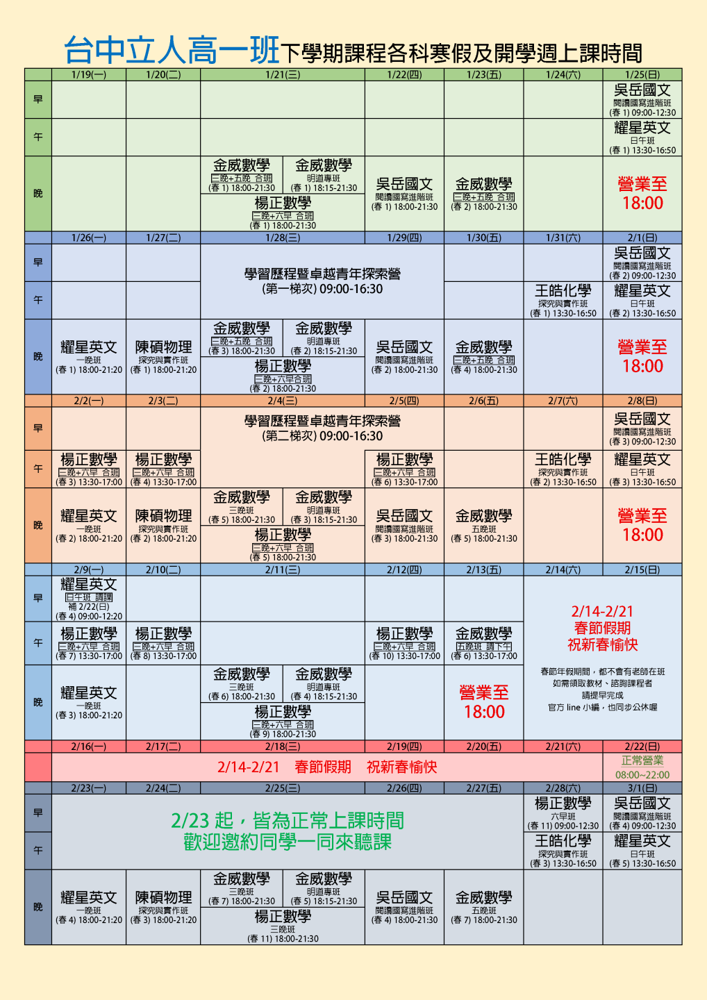 開啟上方區塊 114高一班課程:【114高一】資優超前進度班-台中立人補習班,重考班,高中班,國中班,私中班 課程報名首頁 114高一班課程 瀏覽數:45586 發佈時間:2025-03-16 搜尋 選擇課程分類 升大學重考班高中班課程國中班課程國小班課程彰化分部課程 送出 課程標題:【114高一】資優超前進度班 上課教室:高中班 課程班級:高中班 報名狀態:報名進行中 課程狀態:啟用中 報名紀錄查詢 可查詢所有報名紀錄限報名者 LINE線上客服 頁面QRcode 點擊Facebook分享及讚按鈕,會開啟新視窗輸入內容 開課時間:2026-01-21 18:00 / 結束時間:2026-06-21 17:00 課程星期:星期一 星期二 星期三 星期四 星期五 星期六 星期日 上課地點:臺中市北區尊賢街9號9樓 課程費用:線上洽詢 課程說明 點我加入台中立人官方LINE 【點擊我進入高一班課程線上預約單】 點我加入台中立人官方LINE 【點擊我進入高一班課程線上預約單】 附件下載 download attachment 報名須知 親愛的家長、同學您好: 歡迎您的加入,有關於本班課程詳細規劃,歡迎連結預約唷 本班會盡快請老師回覆您 【重考班課程】線上預約表單連結 【高中班課程】線上預約表單連結 【國中班課程】線上預約表單連結 【私中班課程】線上預約表單連結 【口試班課程】線上預約表單連結 ★台中立人高中班、重考班諮詢專線:04-22238788 ★班址:台中市北區尊賢街9號9樓(台中一中前水利大樓9樓) ———————————————————— ★台中立人私中班、國中班諮詢專線:04-22269882 ★班址:台中市北區三民路三段94巷2號(台中科大天橋巷內) 台中立人官方Line 台中立人官方Facebook粉絲團 台中立人官方YouTube頻道 台中立人官方Instagram 台中立人官方Threads 前往課程報名 前往下一頁→