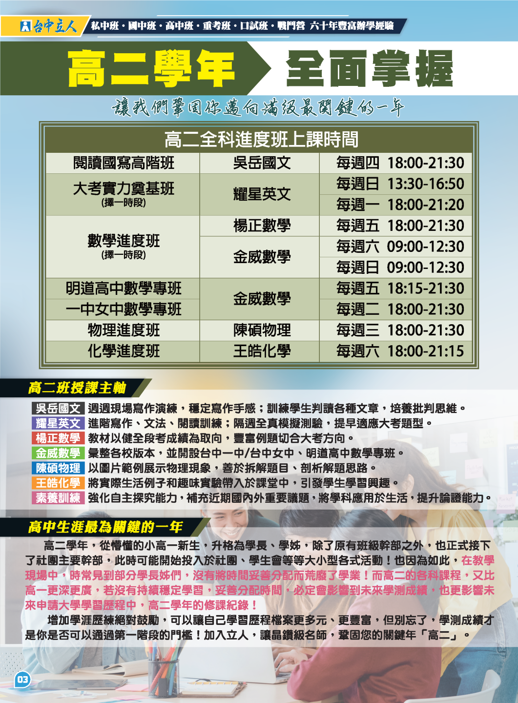 開啟上方區塊 114高二班課程:【114高二】學測實力奠基班-台中立人補習班,重考班,高中班,國中班,私中班 課程報名首頁 114高二班課程 瀏覽數:4166 發佈時間:2025-04-30 搜尋 選擇課程分類 升大學重考班高中班課程國中班課程升私中資優班彰化分部課程 送出 課程標題:【114高二】學測實力奠基班 上課教室:高中班 課程班級:高中班 報名狀態:報名進行中 課程狀態:啟用中 報名紀錄查詢 可查詢所有報名紀錄限報名者 LINE線上客服 頁面QRcode 點擊Facebook分享及讚按鈕,會開啟新視窗輸入內容 開課時間:2025-07-01 18:00 / 結束時間:2026-01-08 21:30 課程星期:星期一 星期二 星期三 星期四 星期五 星期六 星期日 上課地點:臺中市北區尊賢街9號9樓 課程費用:線上洽詢 課程說明 點我加入台中立人官方LINE 【點擊我進入高二課程線上預約單】 點我加入台中立人官方LINE 【點擊我進入高二課程線上預約單】 報名須知 親愛的家長、同學您好: 歡迎您的加入,有關於本班課程詳細規劃,歡迎連結預約唷 本班會盡快請老師回覆您 【重考班課程】線上預約表單連結 【高中班課程】線上預約表單連結 【國中班課程】線上預約表單連結 【私中班課程】線上預約表單連結 【口試班課程】線上預約表單連結 ★台中立人高中班、重考班諮詢專線:04-22238788 ★班址:台中市北區尊賢街9號9樓(台中一中前水利大樓9樓) ———————————————————— ★台中立人私中班、國中班諮詢專線:04-22269882 ★班址:台中市北區三民路三段94巷2號(台中科大天橋巷內) 台中立人官方Line 台中立人官方Facebook粉絲團 台中立人官方YouTube頻道 台中立人官方Instagram 台中立人官方Threads 前往課程報名 前往下一頁→