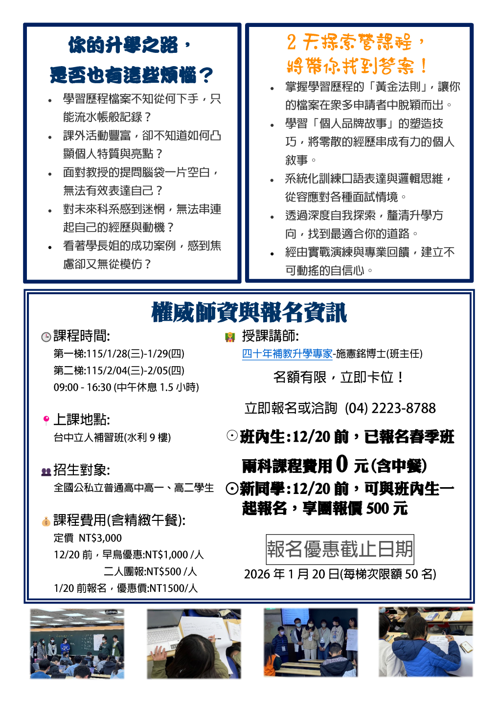 開啟上方區塊 114高二班課程:【114高二】學習歷程暨卓越青年探索營-台中立人補習班,重考班,高中班,國中班,私中班 課程報名首頁 114高二班課程 瀏覽數:94 發佈時間:2025-12-06 搜尋 選擇課程分類 升大學重考班高中班課程國中班課程國小班課程彰化分部課程 送出 課程標題:【114高二】學習歷程暨卓越青年探索營-<兩梯次擇一> 上課教室:高中班 課程班級:高中班 報名狀態:報名進行中 課程狀態:啟用中 報名紀錄查詢 可查詢所有報名紀錄限報名者 LINE線上客服 頁面QRcode 點擊Facebook分享及讚按鈕,會開啟新視窗輸入內容 開課時間:2026-01-28 09:00 / 結束時間:2026-02-05 16:30 課程星期:星期三 星期四 上課地點:臺中市北區尊賢街9號9樓 課程費用:線上洽詢 課程說明 台中立人官方LINE 【學習歷程暨卓越青年探索營線上預約單】 台中立人官方LINE 【學習歷程暨卓越青年探索營線上預約單】 報名須知 親愛的家長、同學您好: 歡迎您的加入,有關於本班課程詳細規劃,歡迎連結預約唷 本班會盡快請老師回覆您 【重考班課程】線上預約表單連結 【高中班課程】線上預約表單連結 【國中班課程】線上預約表單連結 【私中班課程】線上預約表單連結 ★台中立人水利九樓教室:04-22238788 ★班址:台中市北區尊賢街9號9樓(台中一中前水利大樓9樓) ———————————————————— ★台中立人台中本部教室:04-22269882 ★班址:台中市北區三民路三段94巷2號(台中科大天橋巷內) 台中立人官方Line 台中立人官方Facebook粉絲團 台中立人官方YouTube頻道 台中立人官方Instagram 台中立人官方Threads 前往課程報名 ←前往上一頁