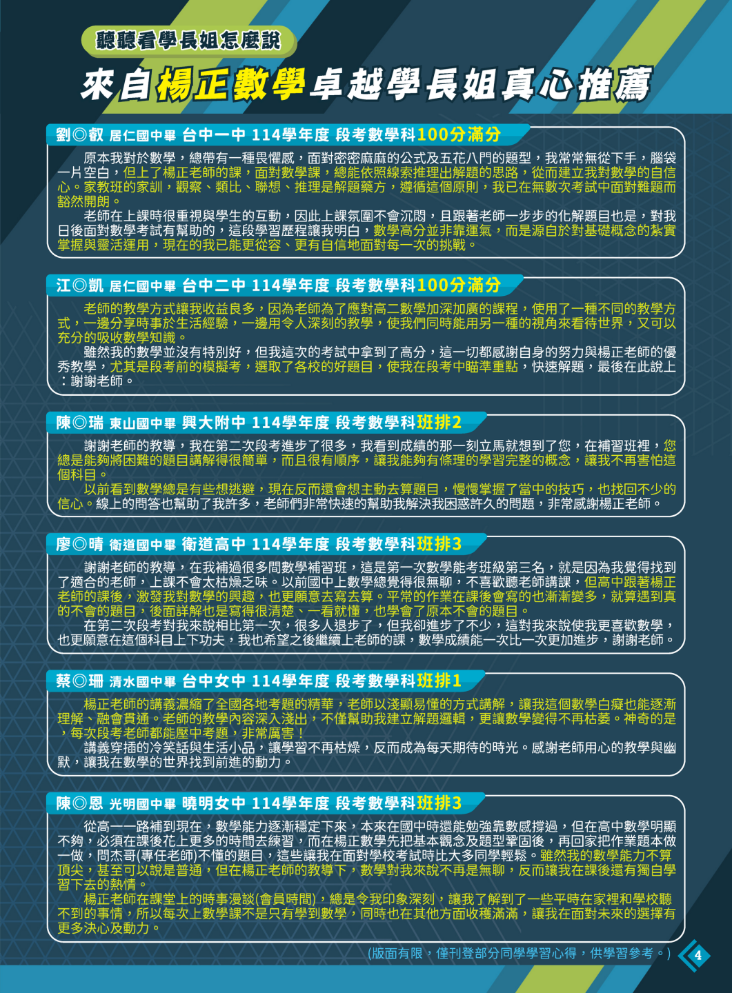 開啟上方區塊 115國三升高一:【115升高一】楊正數學資優數學進度超前班-台中立人補習班,重考班,高中班,國中班,私中班 課程報名首頁 115國三升高一 瀏覽數:258 發佈時間:2026-04-04 搜尋 選擇課程分類 升大學重考班高中班課程國中班課程國小班課程彰化分部課程 送出 課程標題:【115升高一】楊正數學資優數學進度超前班-早鳥優惠實施中 上課教室:高中班 課程班級:高中班 報名狀態:報名進行中 課程狀態:啟用中 報名紀錄查詢 可查詢所有報名紀錄限報名者 LINE線上客服 頁面QRcode 點擊Facebook分享及讚按鈕,會開啟新視窗輸入內容 上課老師:楊正數學觀看詳細簡介 師資簡介 Teacher Profile 在楊正數學教室中,沒有不認真的學生,因為同學們知道,只要稍微一恍神,就可能錯過學習精華!在教學過程中,著重於數學的本質與內涵,讓學生在課堂中,自然而然的學會處理數學問題的根本能力,從不浪費學生的時間。搭配年年精編教材來落實教學理念,讓同學們得到「事半功倍」的效果! 精準掌握題型的獨門講義,不浪費學生的寶貴時間。 重視學生多元發展,是一位落實以「全人教育」為己任的全方位導師。 獨門板書『雙楊指』,輕鬆掌握黑板重點。 開課時間:2026-05-18 12:10 / 結束時間:2027-01-10 12:10 上課地點:臺中市北區尊賢街9號9樓 課程費用:線上洽詢 課程說明 台中立人官方LINE 【115升高一楊正數學線上預約單】 台中立人官方LINE 【115升高一楊正數學線上預約單】 課程影片 報名須知 親愛的家長、同學您好: 歡迎您的加入,有關於本班課程詳細規劃,歡迎連結預約唷 本班會盡快請老師回覆您 【重考班課程】線上預約表單連結 【高中班課程】線上預約表單連結 【國中班課程】線上預約表單連結 【私中班課程】線上預約表單連結 ★台中立人水利九樓教室:04-22238788 ★班址:台中市北區尊賢街9號9樓(台中一中前水利大樓9樓) ———————————————————— ★台中立人台中本部教室:04-22269882 ★班址:台中市北區三民路三段94巷2號(台中科大天橋巷內) 台中立人官方Line 台中立人官方Facebook粉絲團 台中立人官方YouTube頻道 台中立人官方Instagram 台中立人官方Threads 前往課程報名 ←前往上一頁 前往下一頁→
