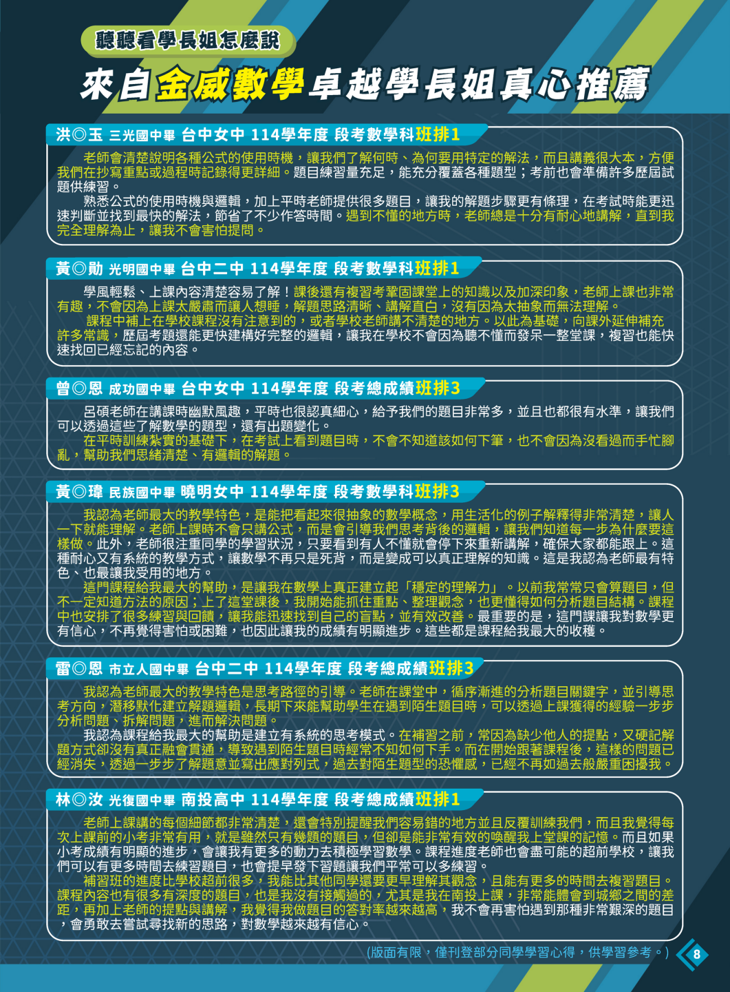 開啟上方區塊 115國三升高一:【115升高一】金威數學資優數學進度超前班-台中立人補習班,重考班,高中班,國中班,私中班 課程報名首頁 115國三升高一 瀏覽數:215 發佈時間:2026-04-04 搜尋 選擇課程分類 升大學重考班高中班課程國中班課程國小班課程彰化分部課程 送出 課程標題:【115升高一】金威數學資優數學進度超前班-早鳥優惠實施中 上課教室:高中班 課程班級:高中班 報名狀態:報名進行中 課程狀態:啟用中 報名紀錄查詢 可查詢所有報名紀錄限報名者 LINE線上客服 頁面QRcode 點擊Facebook分享及讚按鈕,會開啟新視窗輸入內容 上課老師:金威數學觀看詳細簡介 師資簡介 Teacher Profile 師資耐心解惑讓學生不害怕詢問數學,改變考生面對數學的態度。並且引導學生勇於嘗試不怕錯、培養主動思考能力,並且引導學生正確讀題方式。教學觀念講解精闢再帶題,不只單一解題的教學方式,讓考生更能因應題型的變化,靈活運用。 教學資歷豐富、理解每一道數學觀念起源,不讓同學死背公式!重視每一位同學的學習過程、準備方向與未來規劃,透過學測或分科錄取台大。 配合各校版本獨立授課:配合不同學校的段考進度調整學習計劃,大量提供各校段考歷屆題型,熟練各式各樣出題模式,讓學生面對段考及未來大考新式題型能夠輕鬆解題。 注重觀念解析:觀念不清楚只好死背公式、死背計算過程?然而這樣的方式只有題目重新包裝過後,就又不知從何下手,進而對數學失去信心!金威數學特別注重觀念的解析,讓同學能夠看到不同題型,都能找出題目的關鍵訊息,進而靈活運用觀念解題。 開課時間:2026-05-18 12:13 / 結束時間:2027-01-10 12:13 上課地點:臺中市北區尊賢街9號9樓 課程費用:線上洽詢 課程說明 台中立人官方LINE 【115升高一金威數學線上預約單】 台中立人官方LINE 【115升高一金威數學線上預約單】 報名須知 親愛的家長、同學您好: 歡迎您的加入,有關於本班課程詳細規劃,歡迎連結預約唷 本班會盡快請老師回覆您 【重考班課程】線上預約表單連結 【高中班課程】線上預約表單連結 【國中班課程】線上預約表單連結 【私中班課程】線上預約表單連結 ★台中立人水利九樓教室:04-22238788 ★班址:台中市北區尊賢街9號9樓(台中一中前水利大樓9樓) ———————————————————— ★台中立人台中本部教室:04-22269882 ★班址:台中市北區三民路三段94巷2號(台中科大天橋巷內) 台中立人官方Line 台中立人官方Facebook粉絲團 台中立人官方YouTube頻道 台中立人官方Instagram 台中立人官方Threads 前往課程報名 ←前往上一頁 前往下一頁→