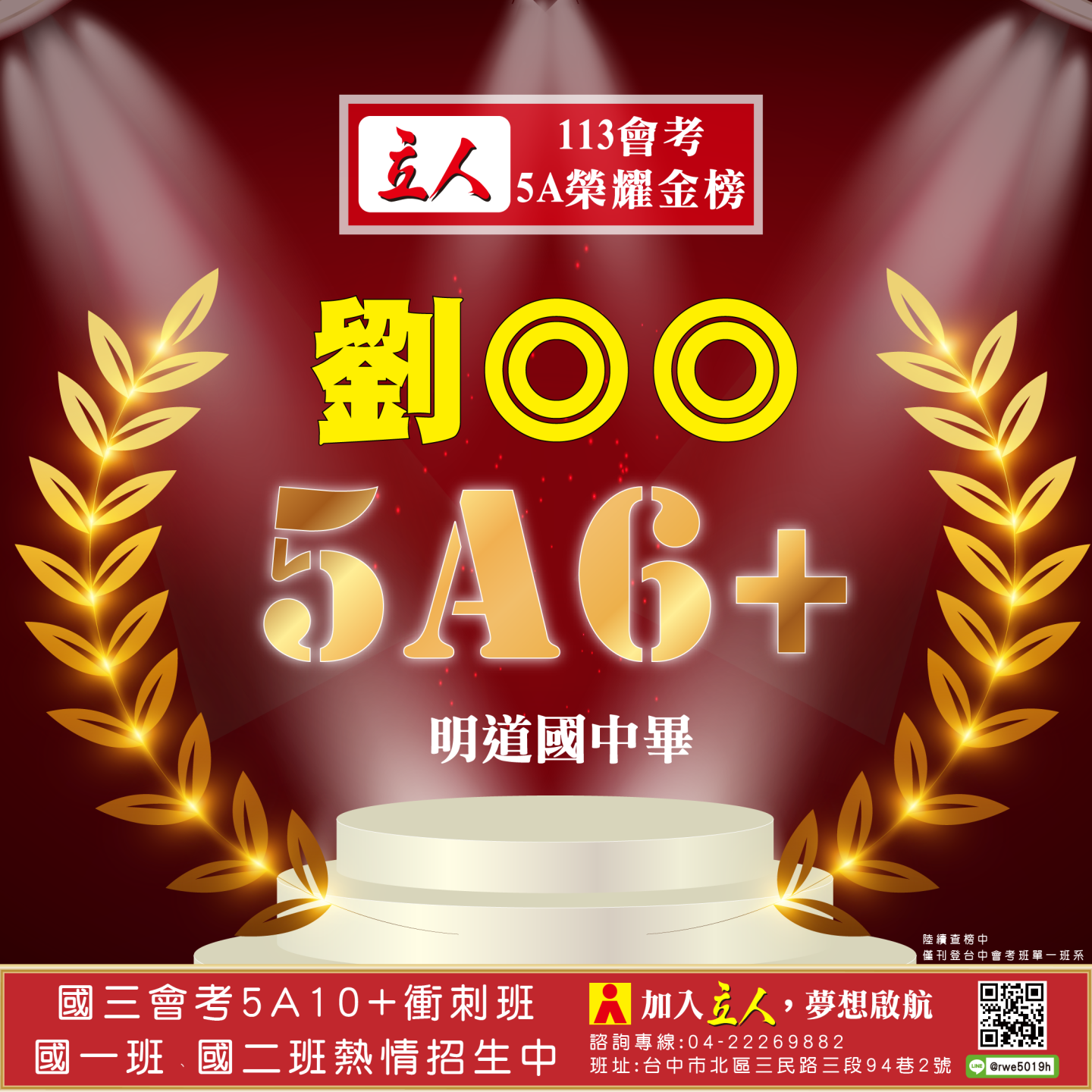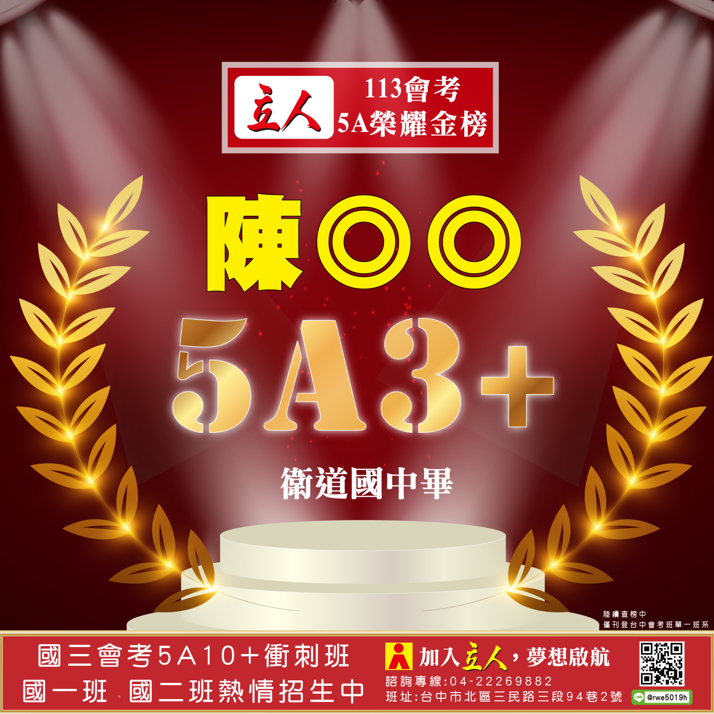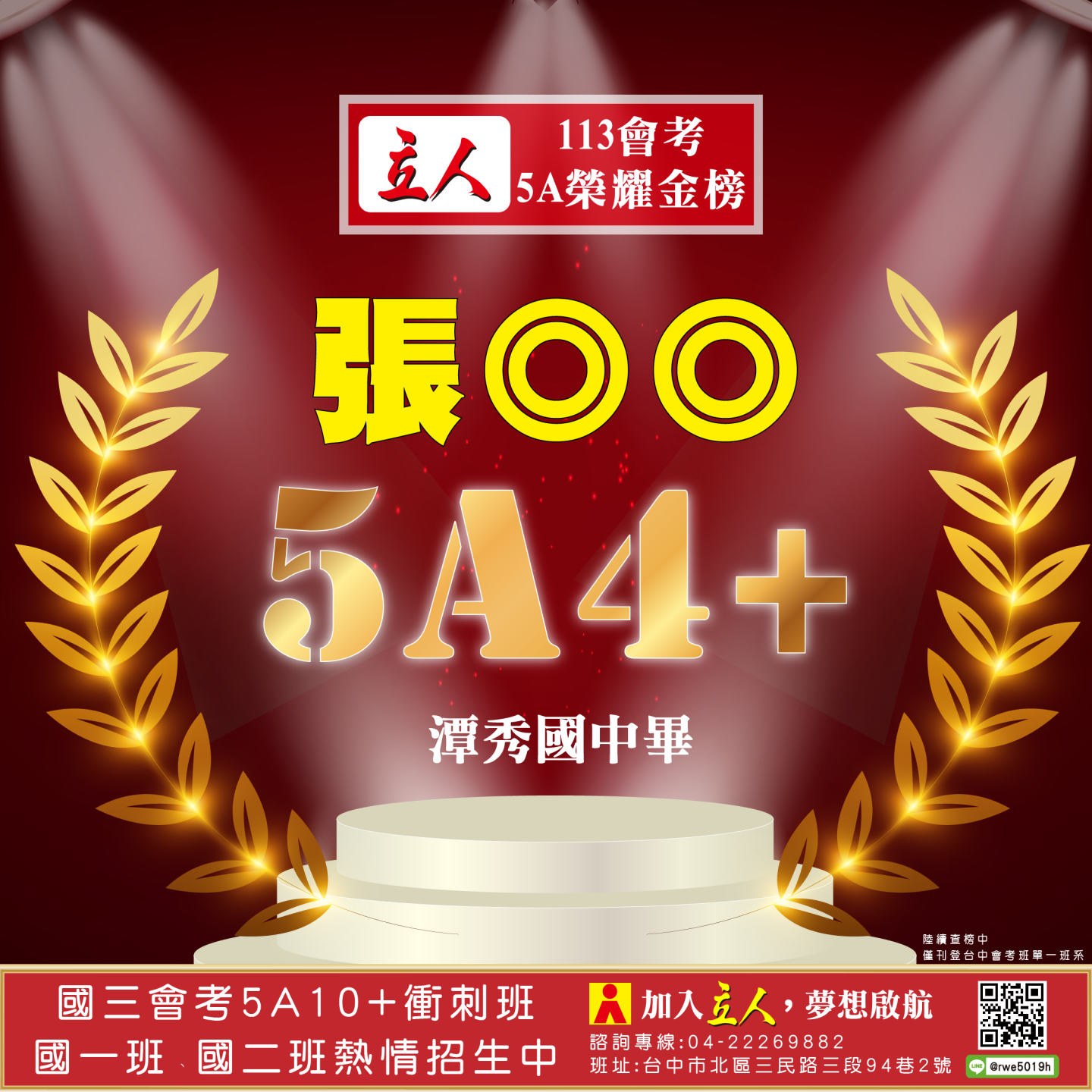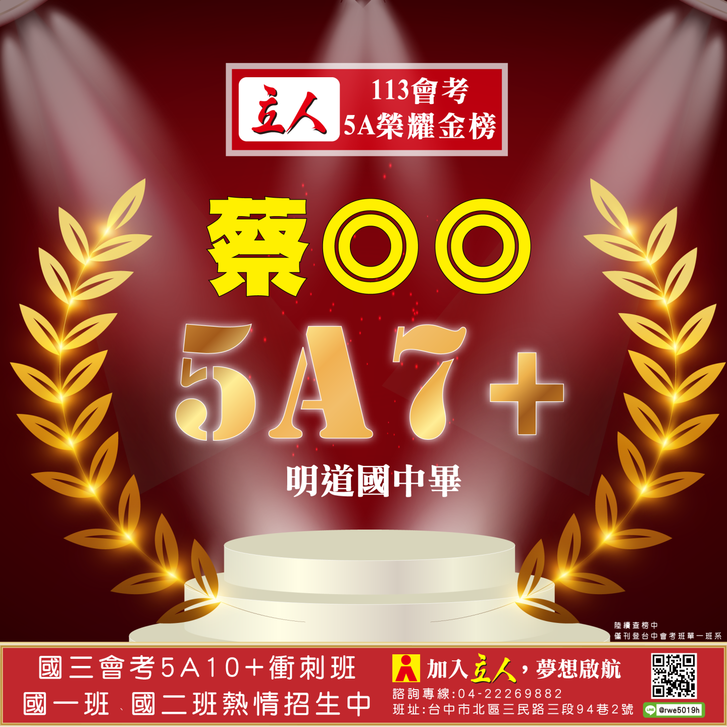 開啟上方區塊 立人榮譽榜:賀!113會考班5A榮耀金榜:台中立人補習班 |私中班|國中班|高中班|重考班|戰鬥營|口面試班|落點分析-台中立人補習班,重考班,高中班,國中班,私中班 返回榮譽首頁 立人榮譽榜 台中總部 熱門榮譽 瀏覽:3847 搜尋 選擇榮譽事項 立人榮譽榜學習心得 選擇發佈單位 台中總部尊賢分部英檢中心彰化分部 選擇發佈會員 管理員Neil hsu立人補習班 選擇榮譽年度 114年 (2025)113年 (2024)112年 (2023)111年 (2022) 送出設定 榮譽事項 學習心得 立人榮譽榜 榮譽事蹟: 賀!113會考班5A榮耀金榜 建立時間: 2024-06-15 10:12 榮譽事項: 立人榮譽榜 發佈單位: 台中總部 發佈會員: 立人補習班 事項內容: 分享榮譽: 點擊Facebook分享及讚按鈕,會開啟新視窗輸入內容 相關榮譽事蹟 2025-11-12台中立人學子 114(上)第一次段考榮耀金榜...887 2025-08-23賀!114升大學國立醫牙、台大電資法商榮耀金榜...1086 2025-07-03賀!114會考班5A榮耀金榜...3455 2025-05-07賀!113會考衝刺班學子,中投區模考表現優異5A金榜!...3873 2024-12-31台中立人學子 113(上)第二次段考成績卓越榜...4614 2024-11-11台中立人學子 113(上)第一次段考成績卓越榜...7270 2024-08-22呂◎峰 明道中學畢 113年申請入學錄取 國立陽明交通大學 醫學系...4148 2024-08-22林◎甫 台中一中畢 113年登記分發錄取 國立陽明交通大學 牙醫學系...5137 2024-08-03吳◎緯 113年明道中學重考最高分 登記分發錄取 國立成功大學 醫學...4560 2024-08-02鍾◎潔 113年曉明女中重考進步王 登記分發錄取 國立陽明交通大學 ...4513 ←上一則榮譽事項 下一則榮譽事項→