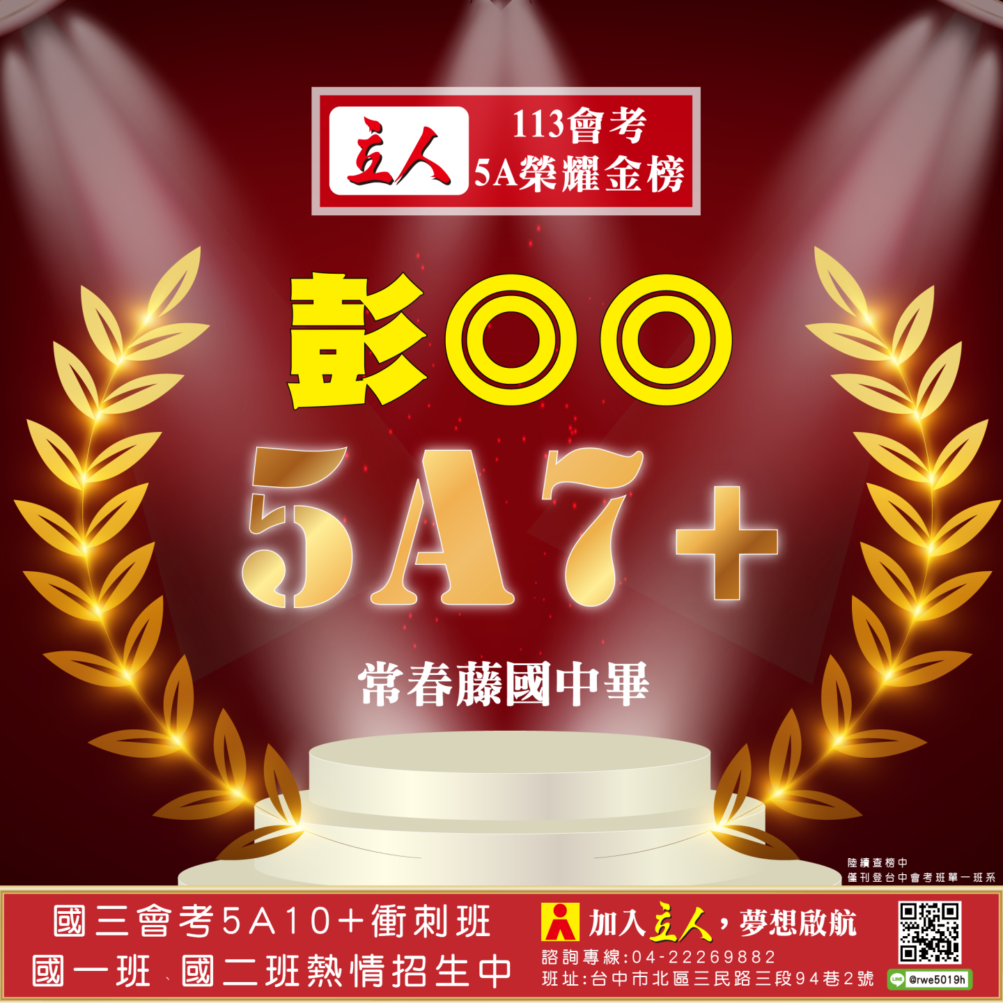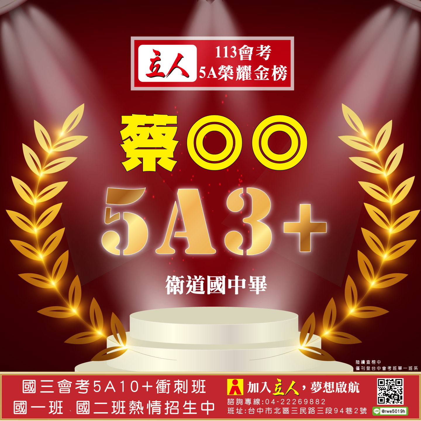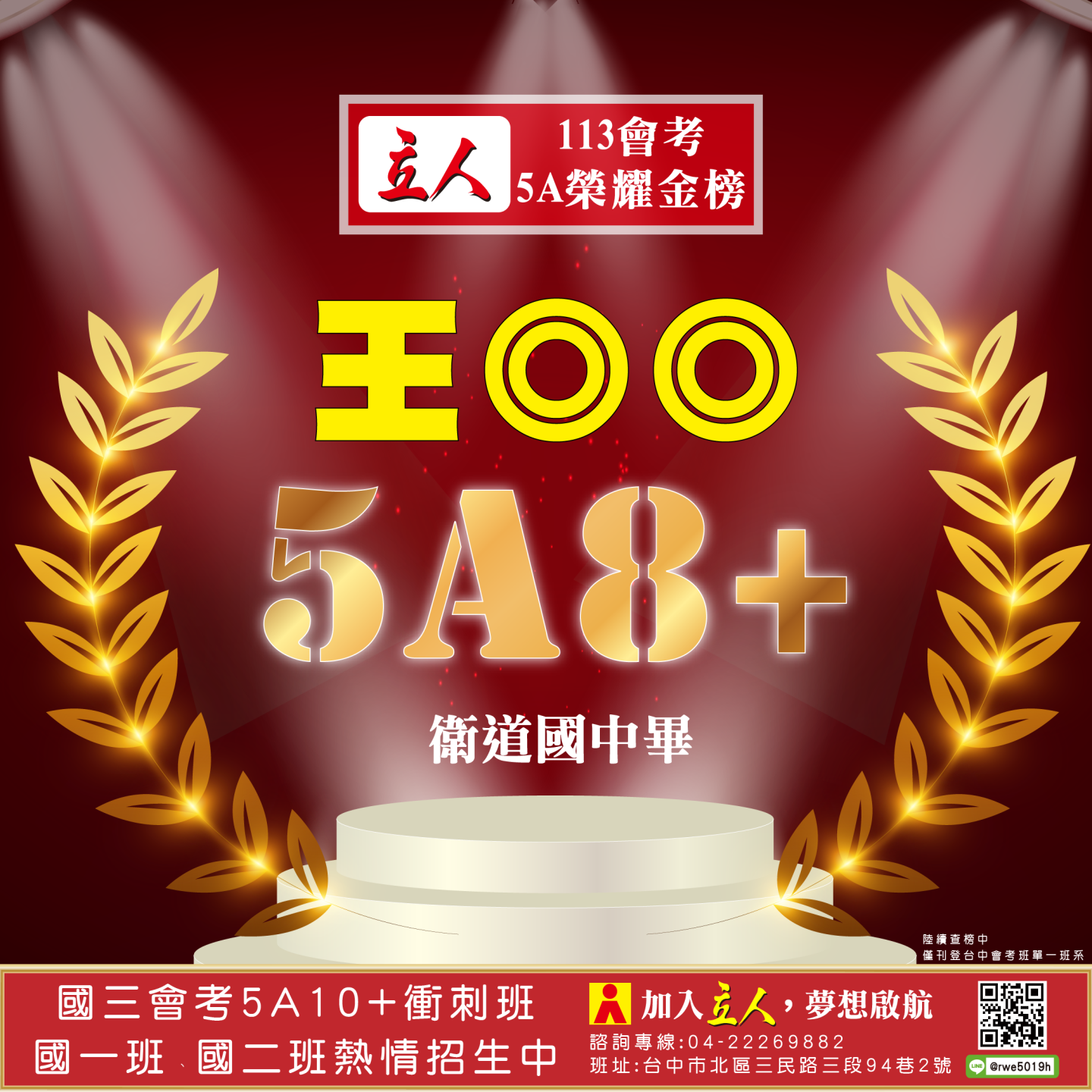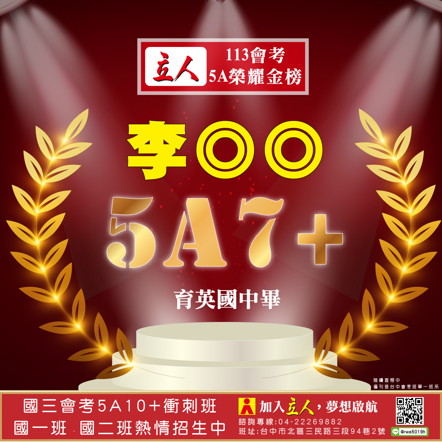 開啟上方區塊 立人榮譽榜:賀!113會考班5A榮耀金榜:台中立人補習班 |私中班|國中班|高中班|重考班|戰鬥營|口面試班|落點分析-台中立人補習班,重考班,高中班,國中班,私中班 返回榮譽首頁 立人榮譽榜 台中總部 熱門榮譽 瀏覽:3847 搜尋 選擇榮譽事項 立人榮譽榜學習心得 選擇發佈單位 台中總部尊賢分部英檢中心彰化分部 選擇發佈會員 管理員Neil hsu立人補習班 選擇榮譽年度 114年 (2025)113年 (2024)112年 (2023)111年 (2022) 送出設定 榮譽事項 學習心得 立人榮譽榜 榮譽事蹟: 賀!113會考班5A榮耀金榜 建立時間: 2024-06-15 10:12 榮譽事項: 立人榮譽榜 發佈單位: 台中總部 發佈會員: 立人補習班 事項內容: 分享榮譽: 點擊Facebook分享及讚按鈕,會開啟新視窗輸入內容 相關榮譽事蹟 2025-11-12台中立人學子 114(上)第一次段考榮耀金榜...887 2025-08-23賀!114升大學國立醫牙、台大電資法商榮耀金榜...1086 2025-07-03賀!114會考班5A榮耀金榜...3455 2025-05-07賀!113會考衝刺班學子,中投區模考表現優異5A金榜!...3873 2024-12-31台中立人學子 113(上)第二次段考成績卓越榜...4614 2024-11-11台中立人學子 113(上)第一次段考成績卓越榜...7270 2024-08-22呂◎峰 明道中學畢 113年申請入學錄取 國立陽明交通大學 醫學系...4148 2024-08-22林◎甫 台中一中畢 113年登記分發錄取 國立陽明交通大學 牙醫學系...5137 2024-08-03吳◎緯 113年明道中學重考最高分 登記分發錄取 國立成功大學 醫學...4560 2024-08-02鍾◎潔 113年曉明女中重考進步王 登記分發錄取 國立陽明交通大學 ...4513 ←上一則榮譽事項 下一則榮譽事項→