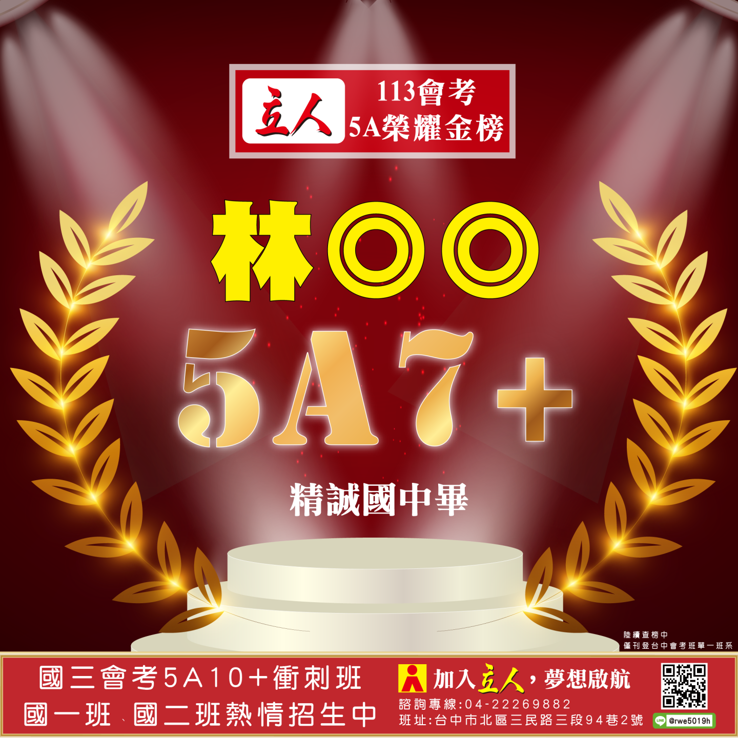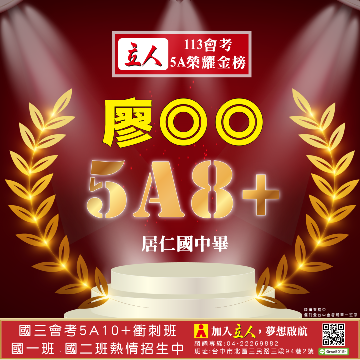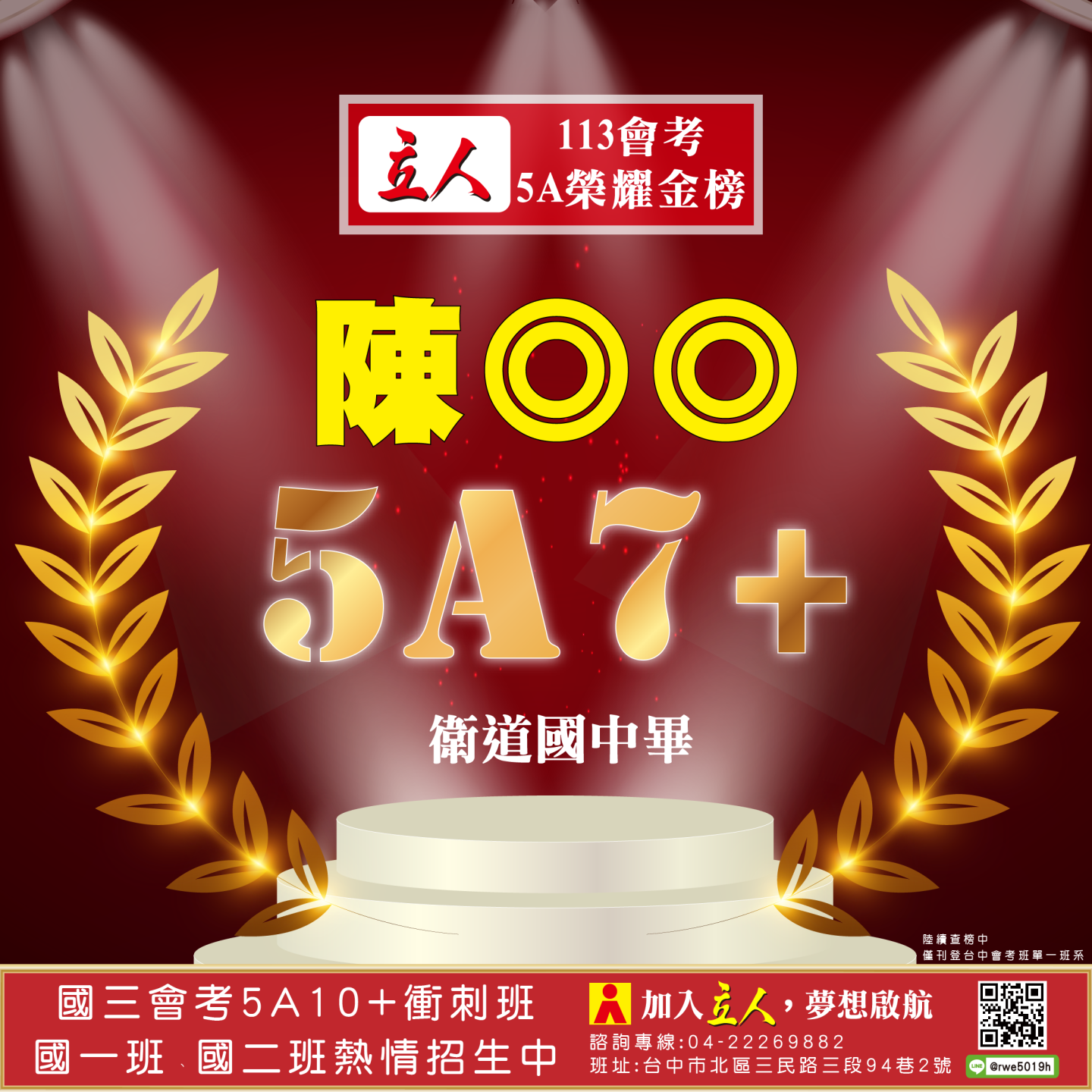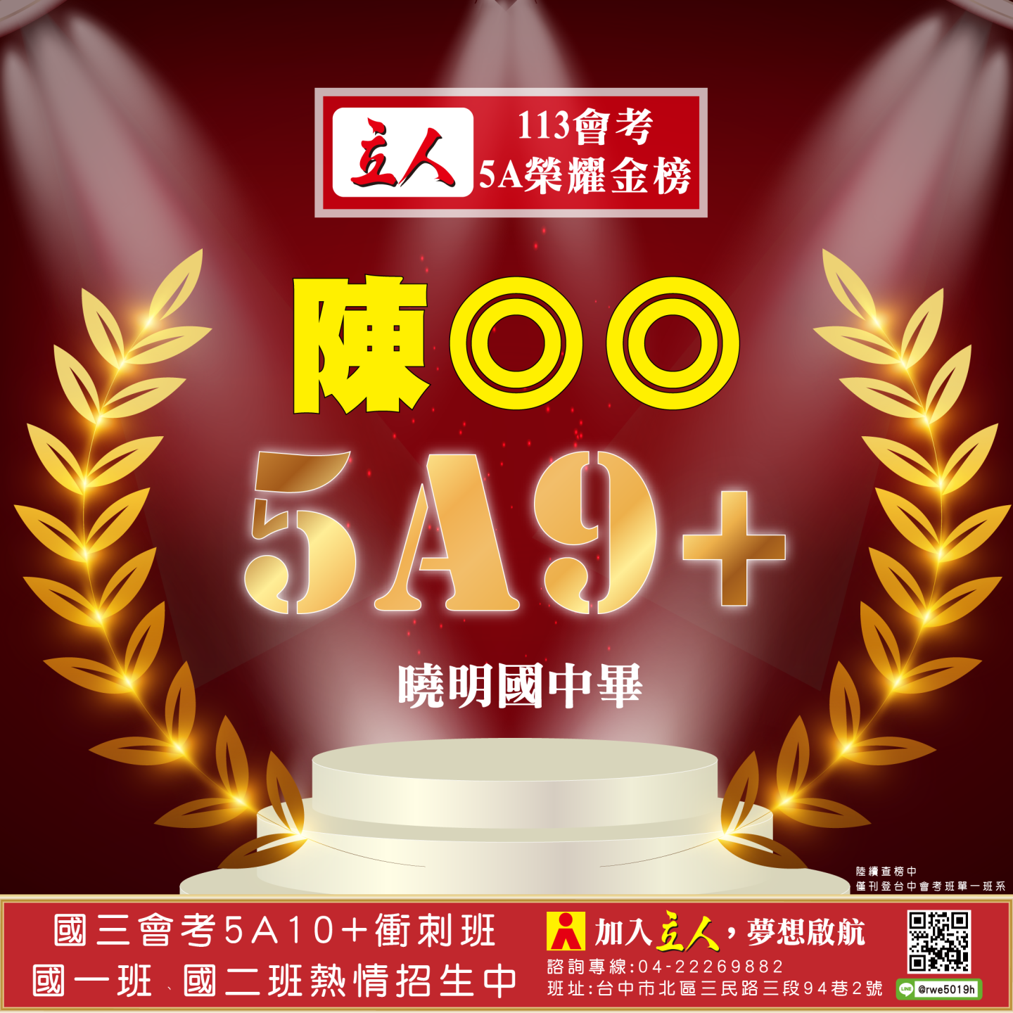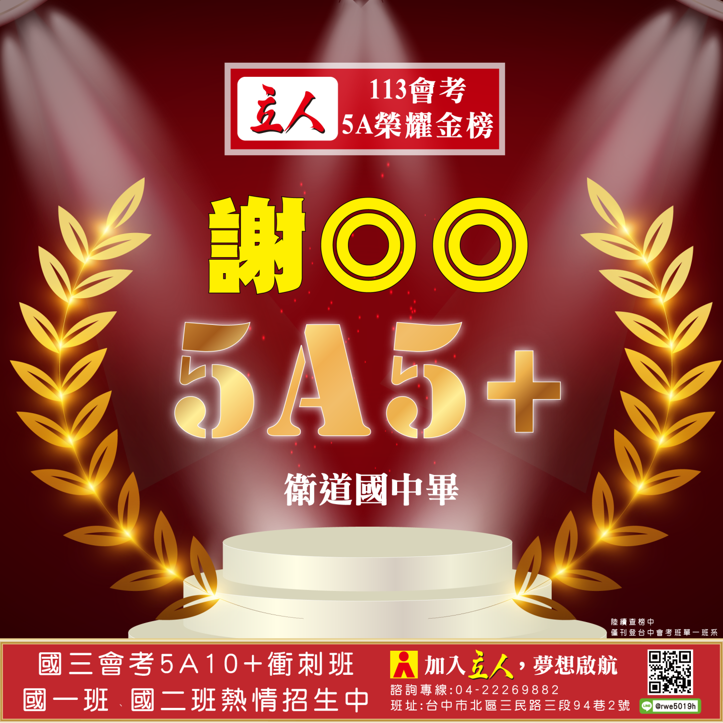 開啟上方區塊 立人榮譽榜:賀!113會考班5A榮耀金榜:台中立人補習班 |私中班|國中班|高中班|重考班|戰鬥營|口面試班|落點分析-台中立人補習班,重考班,高中班,國中班,私中班 返回榮譽首頁 立人榮譽榜 台中總部 熱門榮譽 瀏覽:3847 搜尋 選擇榮譽事項 立人榮譽榜學習心得 選擇發佈單位 台中總部尊賢分部英檢中心彰化分部 選擇發佈會員 管理員Neil hsu立人補習班 選擇榮譽年度 114年 (2025)113年 (2024)112年 (2023)111年 (2022) 送出設定 榮譽事項 學習心得 立人榮譽榜 榮譽事蹟: 賀!113會考班5A榮耀金榜 建立時間: 2024-06-15 10:12 榮譽事項: 立人榮譽榜 發佈單位: 台中總部 發佈會員: 立人補習班 事項內容: 分享榮譽: 點擊Facebook分享及讚按鈕,會開啟新視窗輸入內容 相關榮譽事蹟 2025-11-12台中立人學子 114(上)第一次段考榮耀金榜...887 2025-08-23賀!114升大學國立醫牙、台大電資法商榮耀金榜...1086 2025-07-03賀!114會考班5A榮耀金榜...3455 2025-05-07賀!113會考衝刺班學子,中投區模考表現優異5A金榜!...3873 2024-12-31台中立人學子 113(上)第二次段考成績卓越榜...4614 2024-11-11台中立人學子 113(上)第一次段考成績卓越榜...7270 2024-08-22呂◎峰 明道中學畢 113年申請入學錄取 國立陽明交通大學 醫學系...4148 2024-08-22林◎甫 台中一中畢 113年登記分發錄取 國立陽明交通大學 牙醫學系...5137 2024-08-03吳◎緯 113年明道中學重考最高分 登記分發錄取 國立成功大學 醫學...4560 2024-08-02鍾◎潔 113年曉明女中重考進步王 登記分發錄取 國立陽明交通大學 ...4513 ←上一則榮譽事項 下一則榮譽事項→