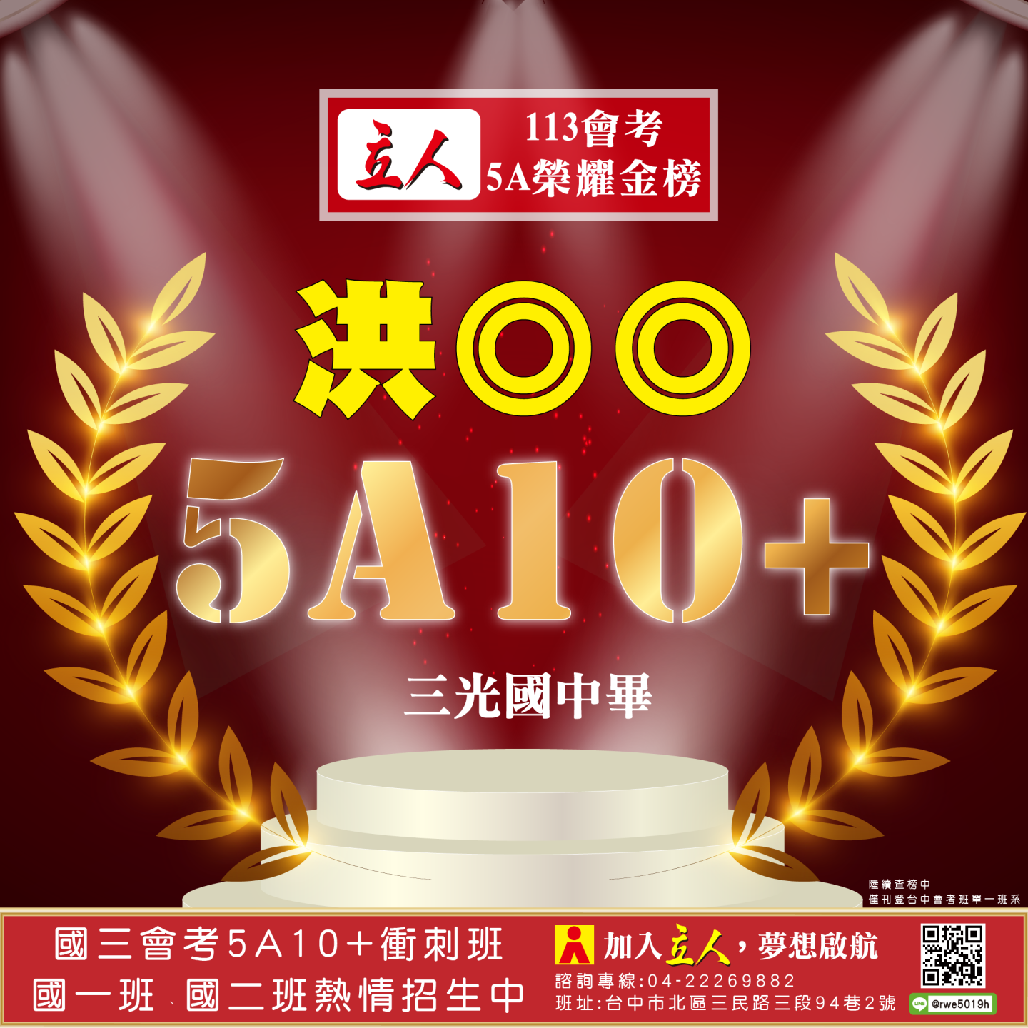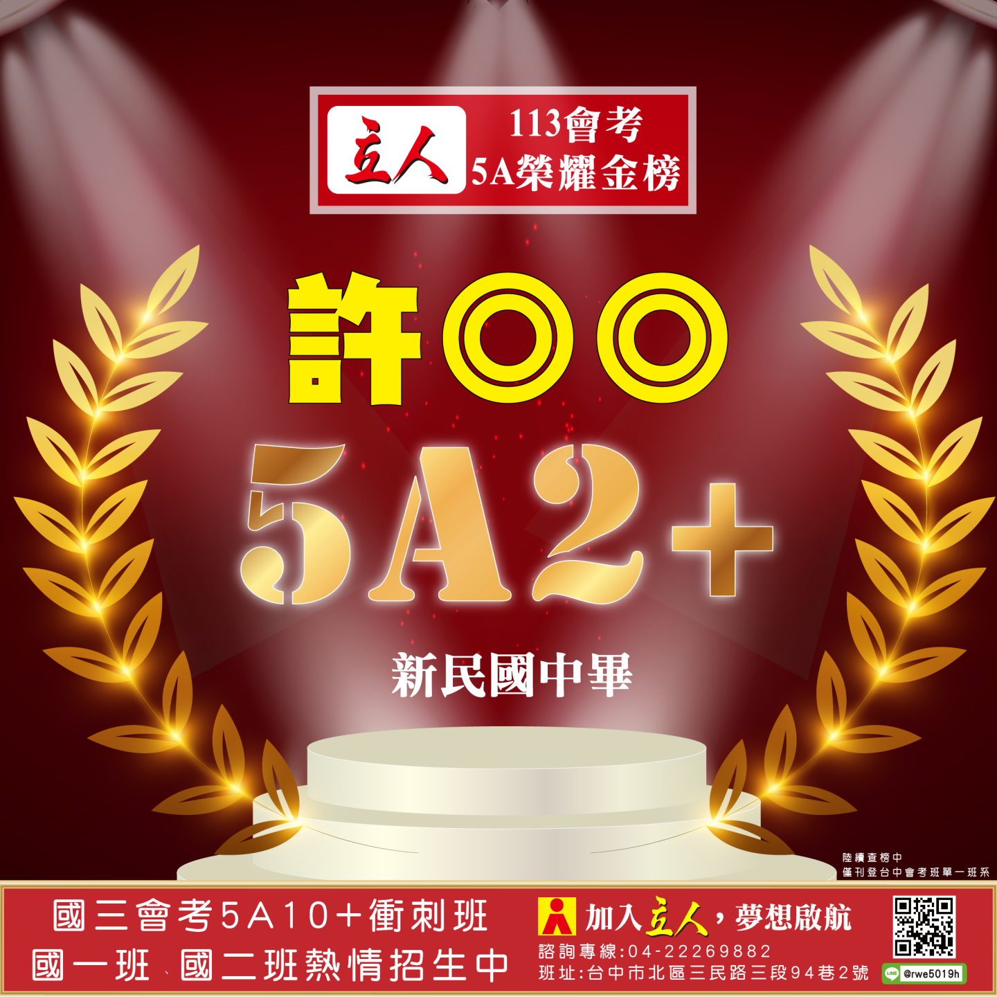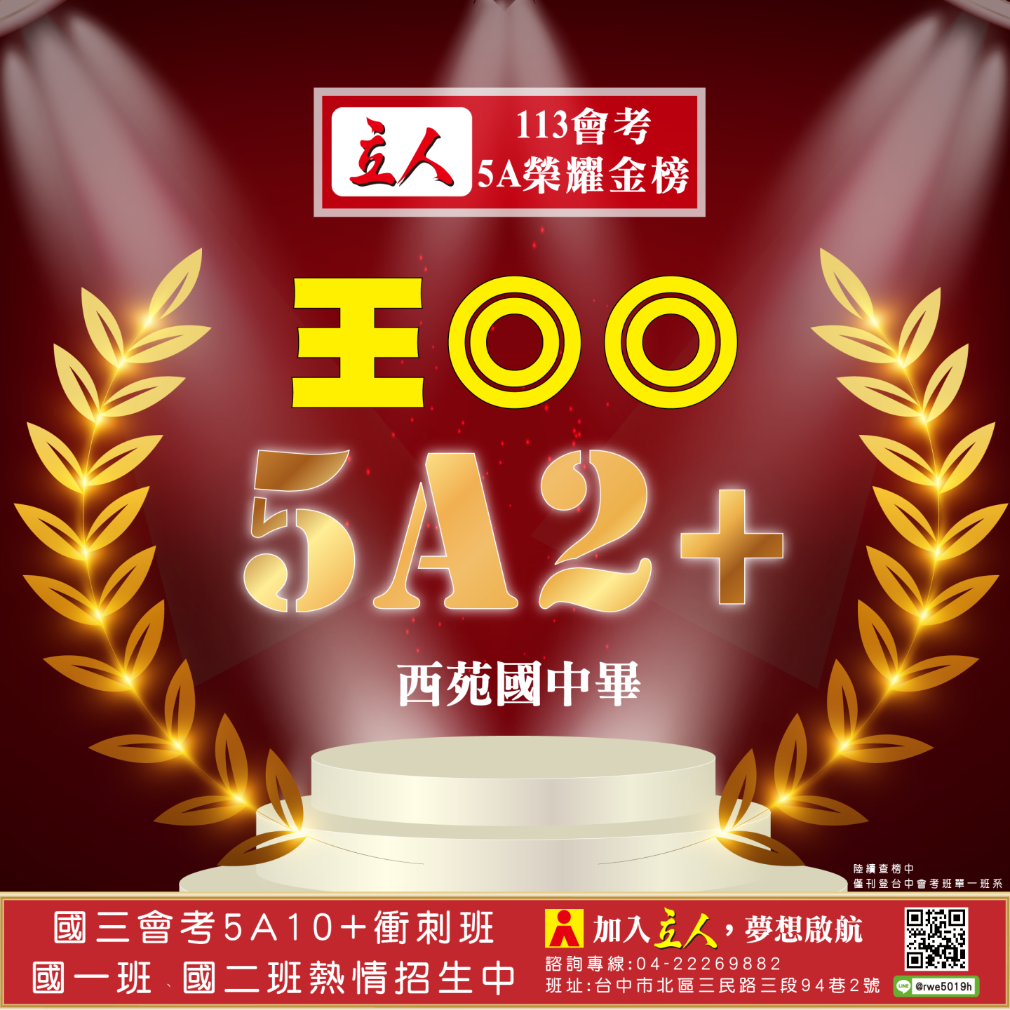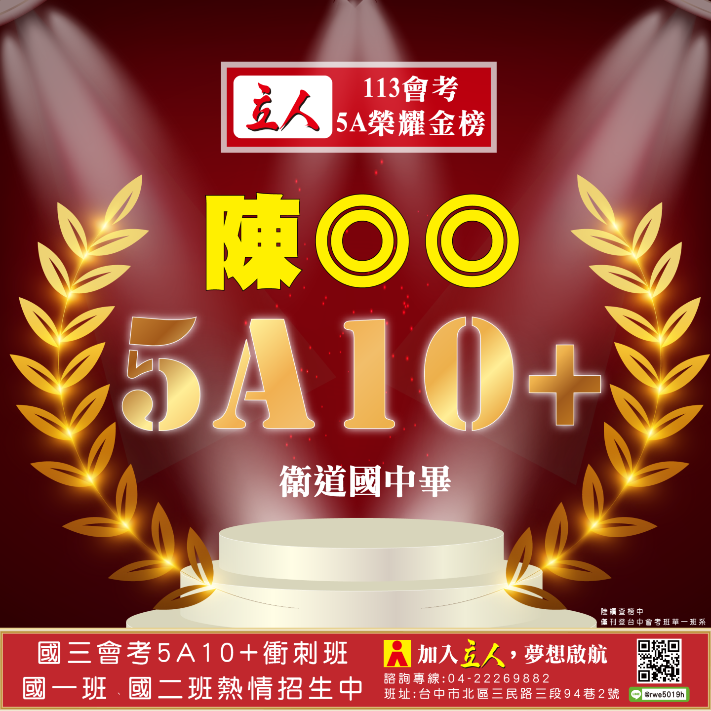 開啟上方區塊 立人榮譽榜:賀!113會考班5A榮耀金榜:台中立人補習班 |私中班|國中班|高中班|重考班|戰鬥營|口面試班|落點分析-台中立人補習班,重考班,高中班,國中班,私中班 返回榮譽首頁 立人榮譽榜 台中總部 熱門榮譽 瀏覽:3847 搜尋 選擇榮譽事項 立人榮譽榜學習心得 選擇發佈單位 台中總部尊賢分部英檢中心彰化分部 選擇發佈會員 管理員Neil hsu立人補習班 選擇榮譽年度 114年 (2025)113年 (2024)112年 (2023)111年 (2022) 送出設定 榮譽事項 學習心得 立人榮譽榜 榮譽事蹟: 賀!113會考班5A榮耀金榜 建立時間: 2024-06-15 10:12 榮譽事項: 立人榮譽榜 發佈單位: 台中總部 發佈會員: 立人補習班 事項內容: 分享榮譽: 點擊Facebook分享及讚按鈕,會開啟新視窗輸入內容 相關榮譽事蹟 2025-11-12台中立人學子 114(上)第一次段考榮耀金榜...887 2025-08-23賀!114升大學國立醫牙、台大電資法商榮耀金榜...1086 2025-07-03賀!114會考班5A榮耀金榜...3455 2025-05-07賀!113會考衝刺班學子,中投區模考表現優異5A金榜!...3873 2024-12-31台中立人學子 113(上)第二次段考成績卓越榜...4614 2024-11-11台中立人學子 113(上)第一次段考成績卓越榜...7270 2024-08-22呂◎峰 明道中學畢 113年申請入學錄取 國立陽明交通大學 醫學系...4148 2024-08-22林◎甫 台中一中畢 113年登記分發錄取 國立陽明交通大學 牙醫學系...5137 2024-08-03吳◎緯 113年明道中學重考最高分 登記分發錄取 國立成功大學 醫學...4560 2024-08-02鍾◎潔 113年曉明女中重考進步王 登記分發錄取 國立陽明交通大學 ...4513 ←上一則榮譽事項 下一則榮譽事項→