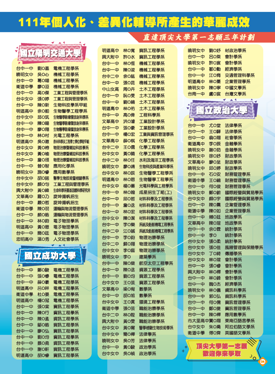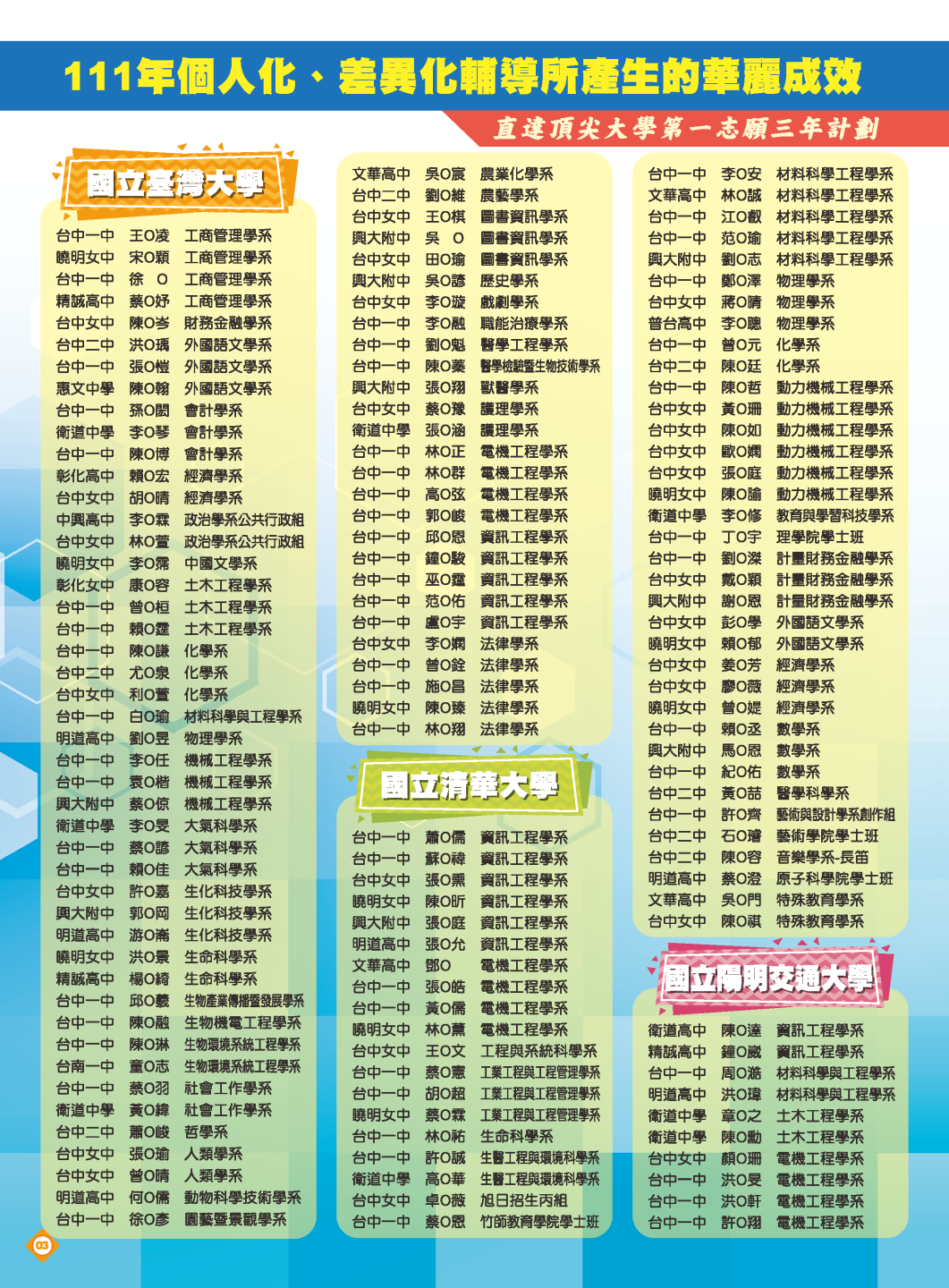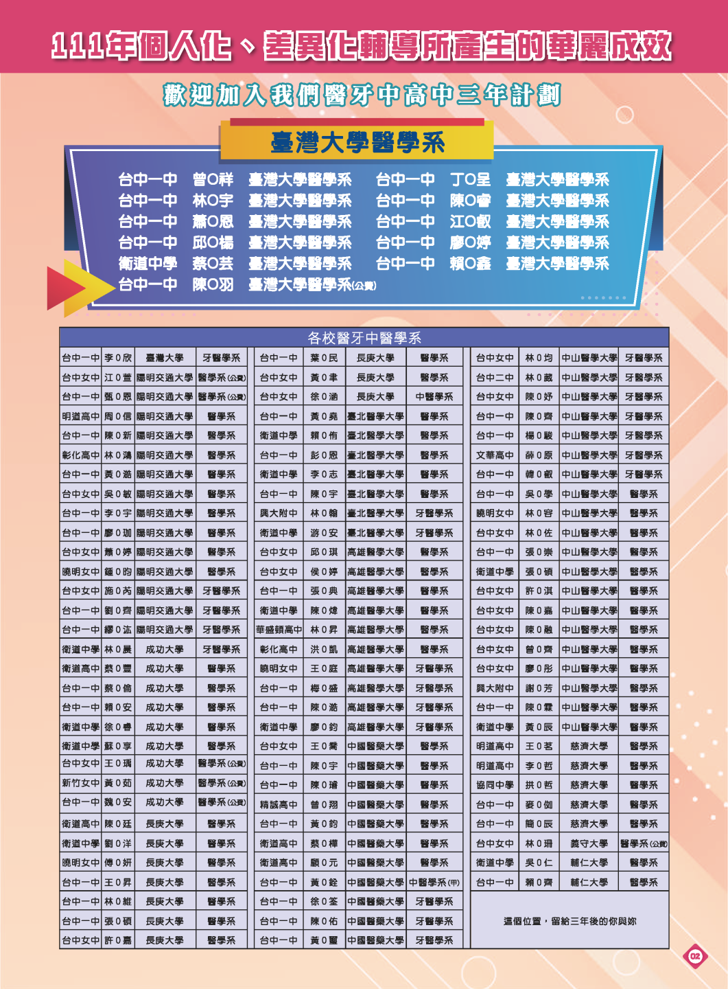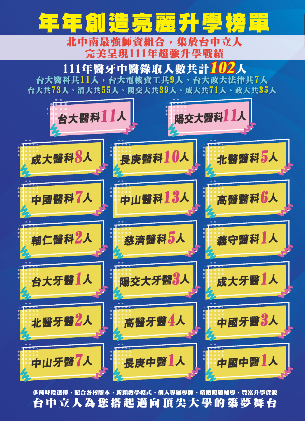 開啟上方區塊 立人榮譽榜:111醫牙中醫頂尖大學榮譽榜,醫牙中醫錄取人數共計102人!:台中立人補習班 |私中班|國中班|高中班|重考班|戰鬥營|口面試班|落點分析-台中立人補習班,重考班,高中班,國中班,私中班 返回榮譽首頁 立人榮譽榜 尊賢分部 熱門榮譽 瀏覽:9455 搜尋 選擇榮譽事項 立人榮譽榜學習心得 選擇發佈單位 台中總部尊賢分部英檢中心彰化分部 選擇發佈會員 管理員Neil hsu立人補習班 選擇榮譽年度 114年 (2025)113年 (2024)112年 (2023)111年 (2022) 送出設定 榮譽事項 學習心得 立人榮譽榜 榮譽事蹟: 111醫牙中醫頂尖大學榮譽榜,醫牙中醫錄取人數共計102人! 建立時間: 2022-10-06 23:39 榮譽事項: 立人榮譽榜 發佈單位: 尊賢分部 發佈會員: 管理員 事項內容: 榮譽標籤: 醫學系牙醫系中醫系 分享榮譽: 點擊Facebook分享及讚按鈕,會開啟新視窗輸入內容 相關榮譽事蹟 2025-11-12台中立人學子 114(上)第一次段考榮耀金榜...952 2025-08-23賀!114升大學國立醫牙、台大電資法商榮耀金榜...1148 2025-07-03賀!114會考班5A榮耀金榜...3475 2025-05-07賀!113會考衝刺班學子,中投區模考表現優異5A金榜!...3890 2024-12-31台中立人學子 113(上)第二次段考成績卓越榜...4630 2024-11-11台中立人學子 113(上)第一次段考成績卓越榜...7286 2024-08-22呂◎峰 明道中學畢 113年申請入學錄取 國立陽明交通大學 醫學系...4168 2024-08-22林◎甫 台中一中畢 113年登記分發錄取 國立陽明交通大學 牙醫學系...5157 2024-08-03吳◎緯 113年明道中學重考最高分 登記分發錄取 國立成功大學 醫學...4578 2024-08-02鍾◎潔 113年曉明女中重考進步王 登記分發錄取 國立陽明交通大學 ...4536 ←上一則榮譽事項 下一則榮譽事項→