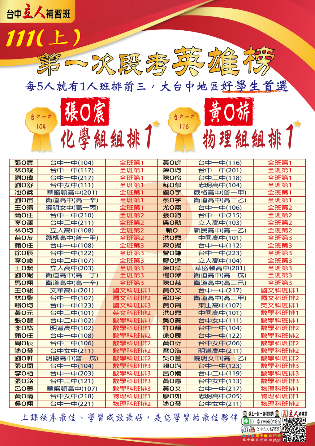開啟上方區塊 立人榮譽榜:台中立人學子 111(上)第一次段考優異成績英雄榜:台中立人補習班 |私中班|國中班|高中班|重考班|戰鬥營|口面試班|落點分析-台中立人補習班,重考班,高中班,國中班,私中班 返回榮譽首頁 立人榮譽榜 尊賢分部 熱門榮譽 瀏覽:8803 搜尋 選擇榮譽事項 立人榮譽榜學習心得 選擇發佈單位 台中總部尊賢分部英檢中心彰化分部 選擇發佈會員 管理員Neil hsu立人補習班 選擇榮譽年度 114年 (2025)113年 (2024)112年 (2023)111年 (2022) 送出設定 榮譽事項 學習心得 立人榮譽榜 榮譽事蹟: 台中立人學子 111(上)第一次段考優異成績英雄榜 建立時間: 2022-11-11 12:45 榮譽事項: 立人榮譽榜 發佈單位: 尊賢分部 發佈會員: 管理員 事項內容: 分享榮譽: 點擊Facebook分享及讚按鈕,會開啟新視窗輸入內容 相關榮譽事蹟 2025-11-12台中立人學子 114(上)第一次段考榮耀金榜...993 2025-08-23賀!114升大學國立醫牙、台大電資法商榮耀金榜...1192 2025-07-03賀!114會考班5A榮耀金榜...3561 2025-05-07賀!113會考衝刺班學子,中投區模考表現優異5A金榜!...3981 2024-12-31台中立人學子 113(上)第二次段考成績卓越榜...4717 2024-11-11台中立人學子 113(上)第一次段考成績卓越榜...7381 2024-08-22呂◎峰 明道中學畢 113年申請入學錄取 國立陽明交通大學 醫學系...4256 2024-08-22林◎甫 台中一中畢 113年登記分發錄取 國立陽明交通大學 牙醫學系...5245 2024-08-03吳◎緯 113年明道中學重考最高分 登記分發錄取 國立成功大學 醫學...4670 2024-08-02鍾◎潔 113年曉明女中重考進步王 登記分發錄取 國立陽明交通大學 ...4628 ←上一則榮譽事項 下一則榮譽事項→