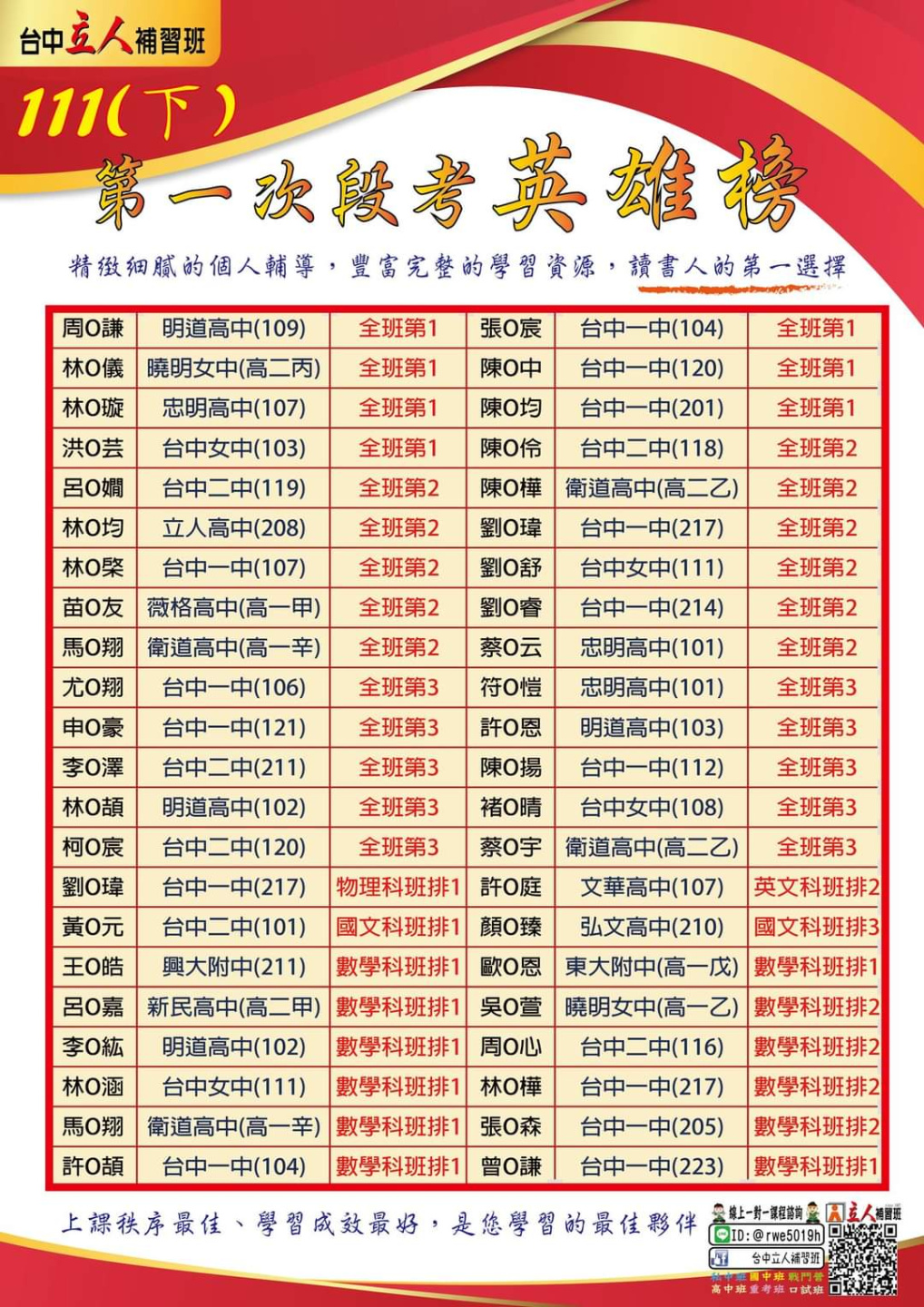 開啟上方區塊 立人榮譽榜:台中立人學子 111(下)第一次段考成績優異風雲榜:台中立人補習班 |私中班|國中班|高中班|重考班|戰鬥營|口面試班|落點分析-台中立人補習班,重考班,高中班,國中班,私中班 返回榮譽首頁 立人榮譽榜 尊賢分部 熱門榮譽 瀏覽:8154 搜尋 選擇榮譽事項 立人榮譽榜學習心得 選擇發佈單位 台中總部尊賢分部英檢中心彰化分部 選擇發佈會員 管理員Neil hsu立人補習班 選擇榮譽年度 114年 (2025)113年 (2024)112年 (2023)111年 (2022) 送出設定 榮譽事項 學習心得 立人榮譽榜 榮譽事蹟: 台中立人學子 111(下)第一次段考成績優異風雲榜 建立時間: 2023-04-30 17:48 榮譽事項: 立人榮譽榜 發佈單位: 尊賢分部 發佈會員: 管理員 事項內容: 分享榮譽: 點擊Facebook分享及讚按鈕,會開啟新視窗輸入內容 相關榮譽事蹟 2025-11-12台中立人學子 114(上)第一次段考榮耀金榜...889 2025-08-23賀!114升大學國立醫牙、台大電資法商榮耀金榜...1092 2025-07-03賀!114會考班5A榮耀金榜...3456 2025-05-07賀!113會考衝刺班學子,中投區模考表現優異5A金榜!...3873 2024-12-31台中立人學子 113(上)第二次段考成績卓越榜...4615 2024-11-11台中立人學子 113(上)第一次段考成績卓越榜...7270 2024-08-22呂◎峰 明道中學畢 113年申請入學錄取 國立陽明交通大學 醫學系...4149 2024-08-22林◎甫 台中一中畢 113年登記分發錄取 國立陽明交通大學 牙醫學系...5138 2024-08-03吳◎緯 113年明道中學重考最高分 登記分發錄取 國立成功大學 醫學...4560 2024-08-02鍾◎潔 113年曉明女中重考進步王 登記分發錄取 國立陽明交通大學 ...4513 ←上一則榮譽事項 下一則榮譽事項→