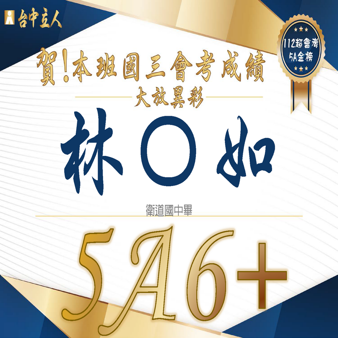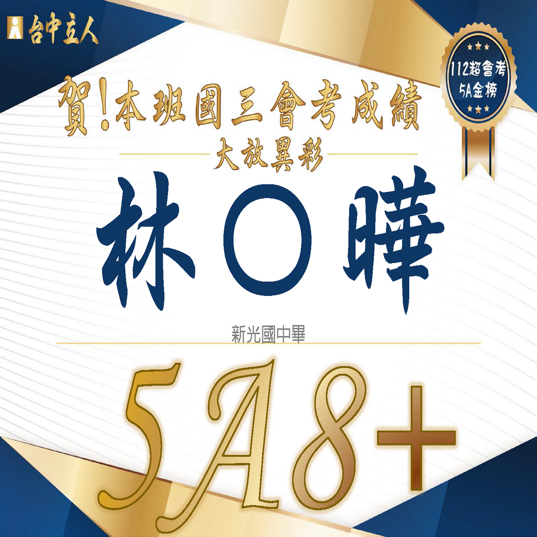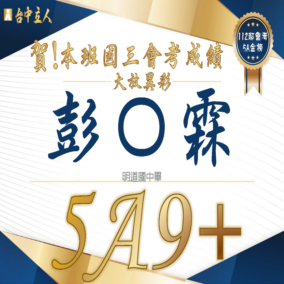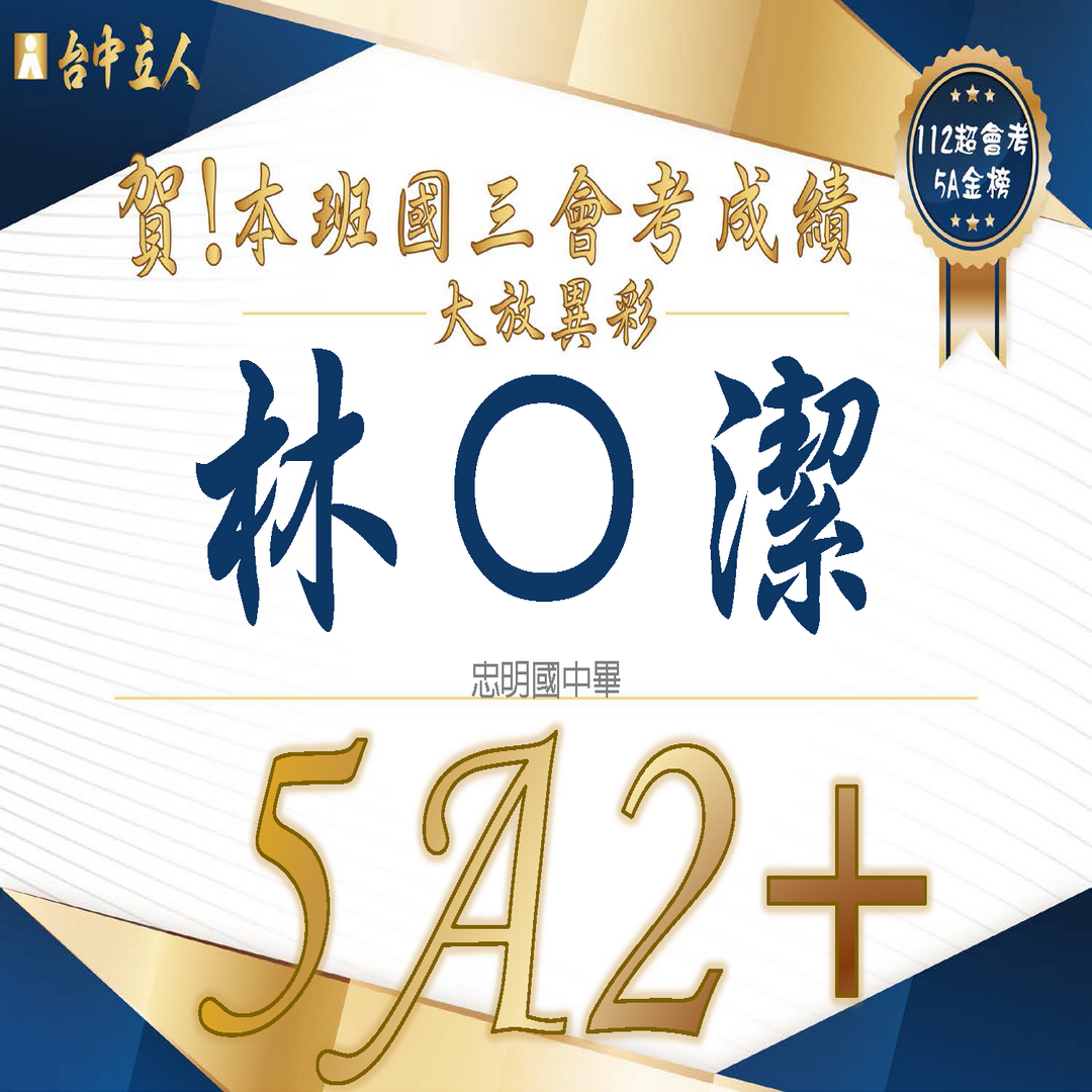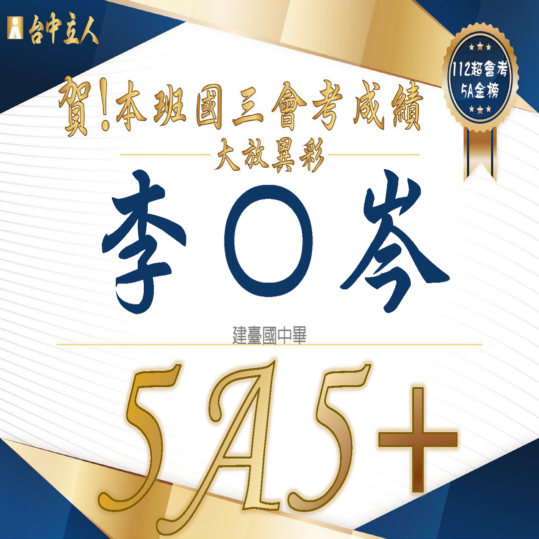 開啟上方區塊 立人榮譽榜:112國三會考班【5A】金榜:台中立人補習班 |私中班|國中班|高中班|重考班|戰鬥營|口面試班|落點分析-台中立人補習班,重考班,高中班,國中班,私中班 返回榮譽首頁 立人榮譽榜 台中總部 熱門榮譽 瀏覽:7086 搜尋 選擇榮譽事項 立人榮譽榜學習心得 選擇發佈單位 台中總部尊賢分部英檢中心彰化分部 選擇發佈會員 管理員Neil hsu立人補習班 選擇榮譽年度 114年 (2025)113年 (2024)112年 (2023)111年 (2022) 送出設定 榮譽事項 學習心得 立人榮譽榜 榮譽事蹟: 112國三會考班【5A】金榜 建立時間: 2023-06-15 01:26 榮譽事項: 立人榮譽榜 發佈單位: 台中總部 發佈會員: 立人補習班 事項內容: 榮譽標籤: 112會考5A 分享榮譽: 點擊Facebook分享及讚按鈕,會開啟新視窗輸入內容 相關榮譽事蹟 2025-11-12台中立人學子 114(上)第一次段考榮耀金榜...887 2025-08-23賀!114升大學國立醫牙、台大電資法商榮耀金榜...1089 2025-07-03賀!114會考班5A榮耀金榜...3455 2025-05-07賀!113會考衝刺班學子,中投區模考表現優異5A金榜!...3873 2024-12-31台中立人學子 113(上)第二次段考成績卓越榜...4614 2024-11-11台中立人學子 113(上)第一次段考成績卓越榜...7270 2024-08-22呂◎峰 明道中學畢 113年申請入學錄取 國立陽明交通大學 醫學系...4148 2024-08-22林◎甫 台中一中畢 113年登記分發錄取 國立陽明交通大學 牙醫學系...5137 2024-08-03吳◎緯 113年明道中學重考最高分 登記分發錄取 國立成功大學 醫學...4560 2024-08-02鍾◎潔 113年曉明女中重考進步王 登記分發錄取 國立陽明交通大學 ...4513 ←上一則榮譽事項 下一則榮譽事項→