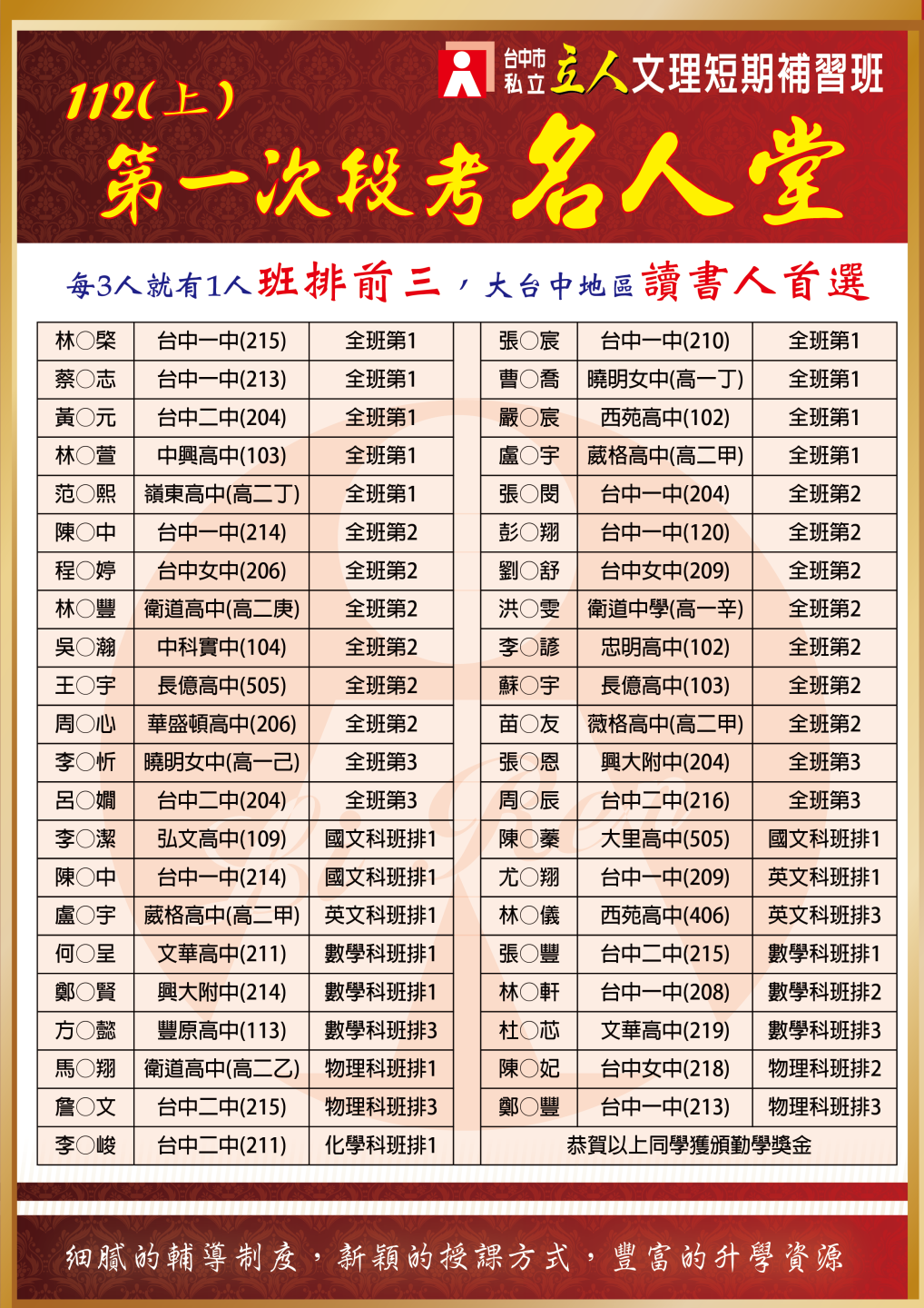 開啟上方區塊 立人榮譽榜:台中立人學子 112(上)第一次段考名人堂:台中立人補習班 |私中班|國中班|高中班|重考班|戰鬥營|口面試班|落點分析-台中立人補習班,重考班,高中班,國中班,私中班 返回榮譽首頁 立人榮譽榜 尊賢分部 熱門榮譽 瀏覽:5627 搜尋 選擇榮譽事項 立人榮譽榜學習心得 選擇發佈單位 台中總部尊賢分部英檢中心彰化分部 選擇發佈會員 管理員Neil hsu立人補習班 選擇榮譽年度 114年 (2025)113年 (2024)112年 (2023)111年 (2022) 送出設定 榮譽事項 學習心得 立人榮譽榜 榮譽事蹟: 台中立人學子 112(上)第一次段考名人堂 建立時間: 2023-11-08 10:20 榮譽事項: 立人榮譽榜 發佈單位: 尊賢分部 發佈會員: 立人補習班 事項內容: 分享榮譽: 點擊Facebook分享及讚按鈕,會開啟新視窗輸入內容 相關榮譽事蹟 2025-11-12台中立人學子 114(上)第一次段考榮耀金榜...898 2025-08-23賀!114升大學國立醫牙、台大電資法商榮耀金榜...1095 2025-07-03賀!114會考班5A榮耀金榜...3456 2025-05-07賀!113會考衝刺班學子,中投區模考表現優異5A金榜!...3873 2024-12-31台中立人學子 113(上)第二次段考成績卓越榜...4615 2024-11-11台中立人學子 113(上)第一次段考成績卓越榜...7270 2024-08-22呂◎峰 明道中學畢 113年申請入學錄取 國立陽明交通大學 醫學系...4149 2024-08-22林◎甫 台中一中畢 113年登記分發錄取 國立陽明交通大學 牙醫學系...5138 2024-08-03吳◎緯 113年明道中學重考最高分 登記分發錄取 國立成功大學 醫學...4561 2024-08-02鍾◎潔 113年曉明女中重考進步王 登記分發錄取 國立陽明交通大學 ...4514 ←上一則榮譽事項 下一則榮譽事項→