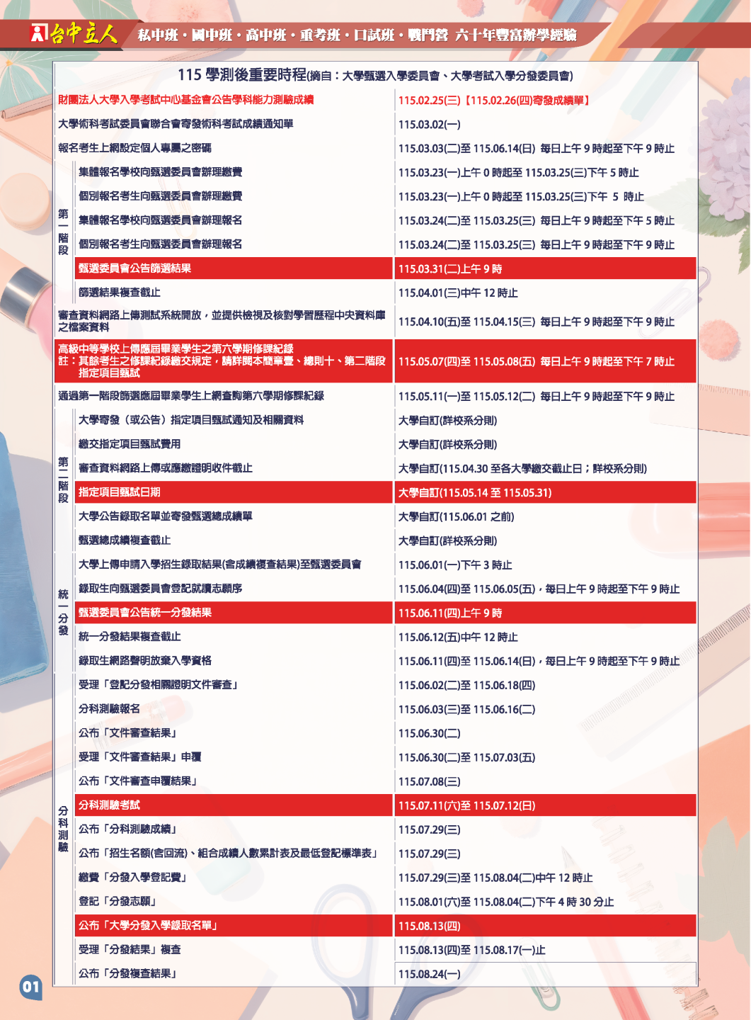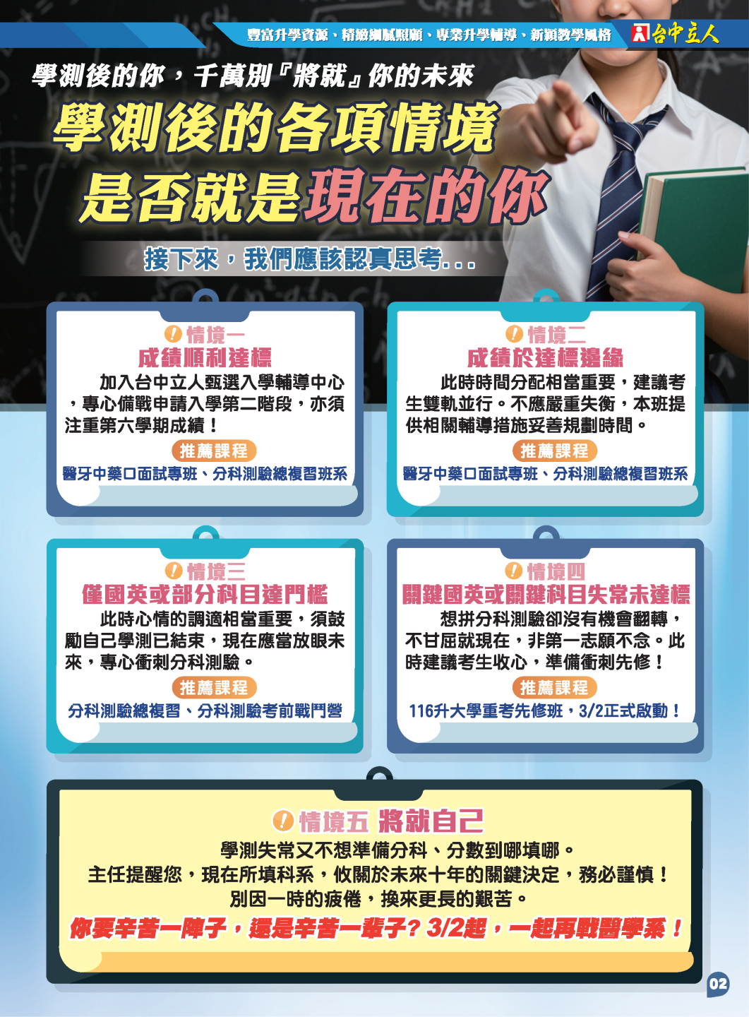 開啟上方區塊 114高三班課程:【114高三】升大學衝刺班-台中立人補習班,重考班,高中班,國中班,私中班 課程報名首頁 114高三班課程 瀏覽數:11629 發佈時間:2025-04-30 搜尋 選擇課程分類 升大學重考班高中班課程國中班課程國小班課程彰化分部課程 送出 課程標題:【114高三】升大學衝刺班 上課教室:高中班 課程班級:高中班 報名狀態:報名進行中 課程狀態:啟用中 報名紀錄查詢 可查詢所有報名紀錄限報名者 LINE線上客服 頁面QRcode 點擊Facebook分享及讚按鈕,會開啟新視窗輸入內容 開課時間:2026-01-25 13:30 / 結束時間:2026-07-10 12:00 課程星期:星期一 星期二 星期三 星期四 星期五 星期六 星期日 上課地點:臺中市北區尊賢街9號9樓 課程費用:線上洽詢 課程說明 點我加入台中立人官方LINE 【高三課程線上預約單】 點我加入台中立人官方LINE 【點擊我進入高三課程線上預約單】 報名須知 親愛的家長、同學您好: 歡迎您的加入,有關於本班課程詳細規劃,歡迎連結預約唷 本班會盡快請老師回覆您 【重考班課程】線上預約表單連結 【高中班課程】線上預約表單連結 【國中班課程】線上預約表單連結 【私中班課程】線上預約表單連結 【口試班課程】線上預約表單連結 ★台中立人高中班、重考班諮詢專線:04-22238788 ★班址:台中市北區尊賢街9號9樓(台中一中前水利大樓9樓) ———————————————————— ★台中立人私中班、國中班諮詢專線:04-22269882 ★班址:台中市北區三民路三段94巷2號(台中科大天橋巷內) 台中立人官方Line 台中立人官方Facebook粉絲團 台中立人官方YouTube頻道 台中立人官方Instagram 台中立人官方Threads 前往課程報名 前往下一頁→